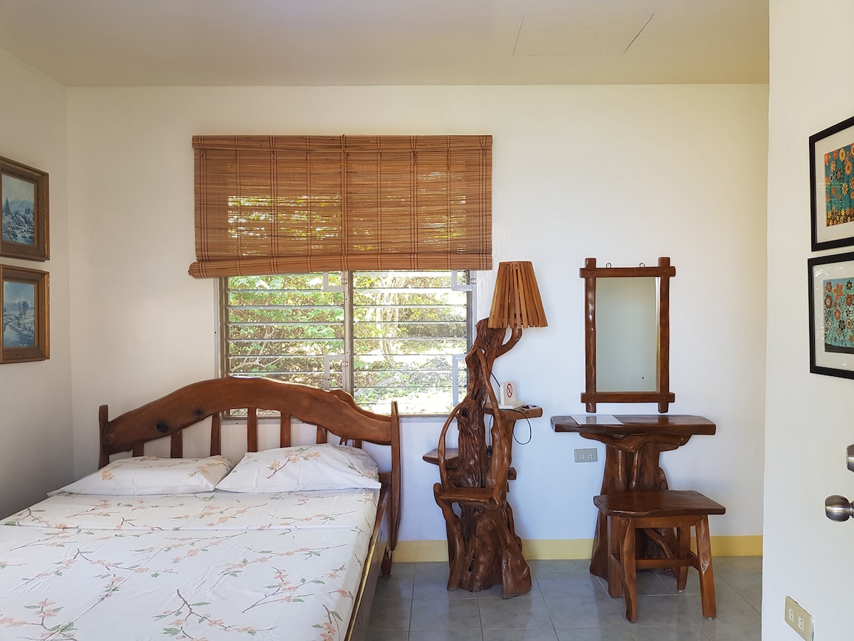 The small house has one bedroom/living room with a private bathroom, kitchen and patio. The bedroom has two beds (one double), a cabinet with a mirror, split-level quiet aircon, a ceiling fan, a TV, and a separate private entrance. The guests can use the large garden, the two native rest houses - one on top of the cliff coast - and the stairs to the sea. The room rate is for two guests. A third guest can be accommodated for an additional charge of P 800