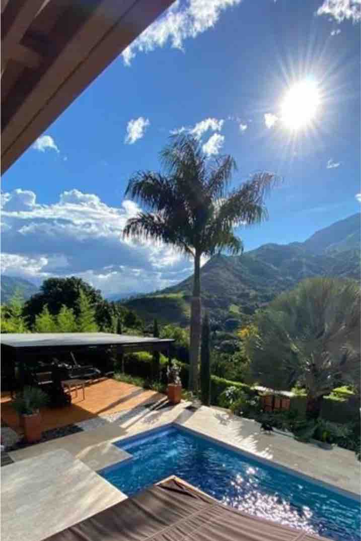 This spectacular house sits atop its own hill in an Avocado farm. It has 360 deg views inc Penol lake and has been recently built to be genuinely luxurious. The house has a spectacular double height living space, gorgeous modern kitchen and 4 bathrooms, and a huge master bedroom with en suite and balcony. Also a beautiful terrace inc huge hot tub, a pergola, a built in BBQ, a v.large open fire, fast WIFI, Netflix, hammocks and proper showers. The house and setting are genuinely breathtaking!
