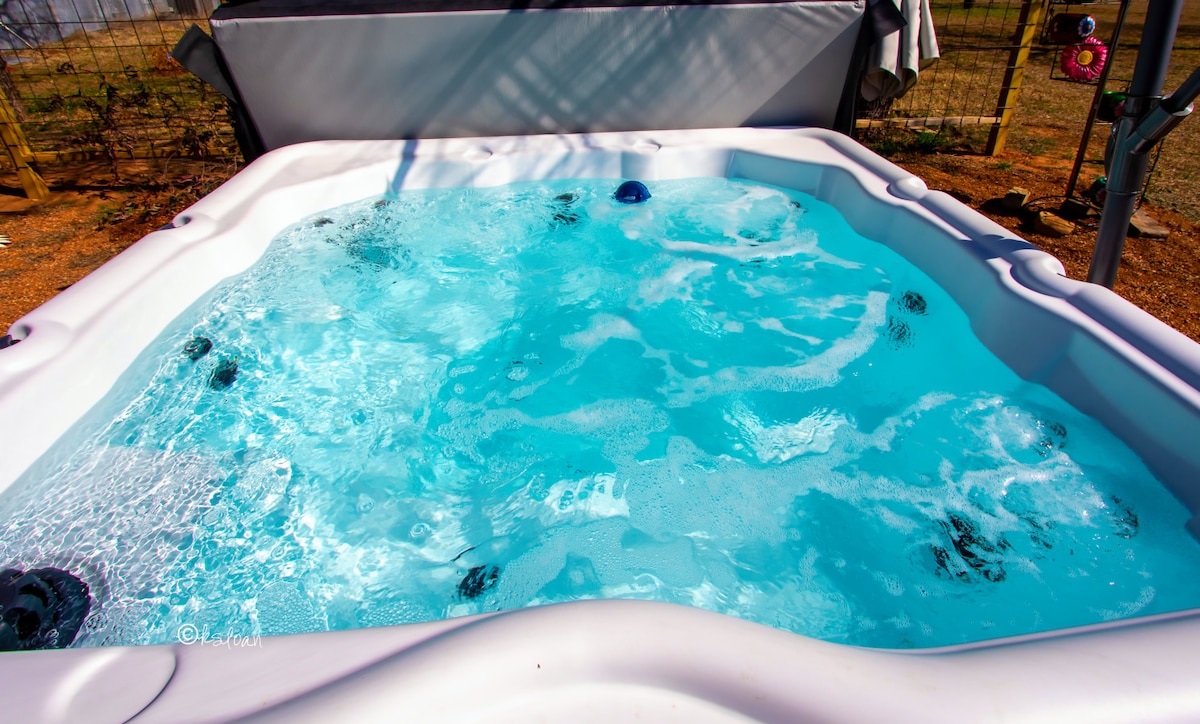 小木屋位于140英亩的野生动物牧场上。热水浴缸。河流。