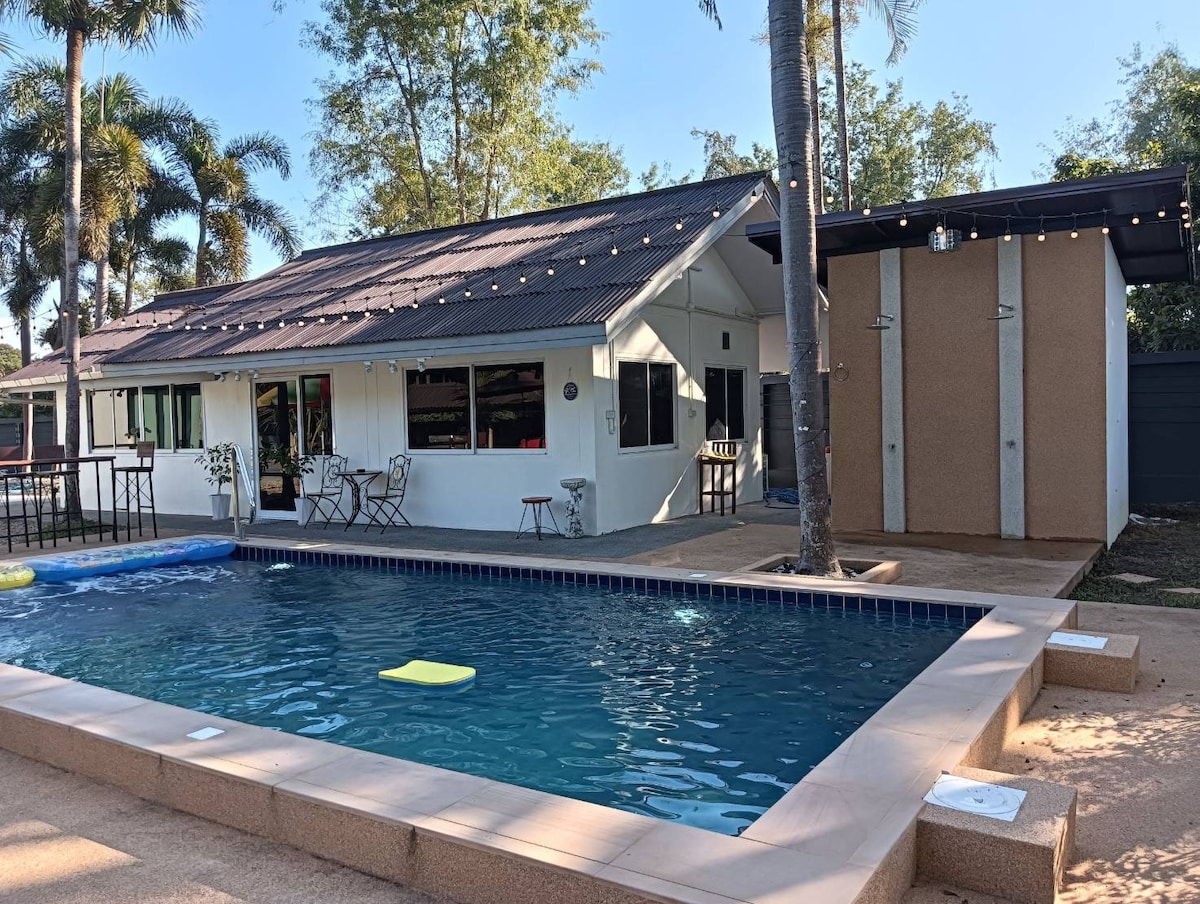 入住这处位于市中心的房源,让家人享受一切近在咫尺的便利。别墅以希腊圣托里尼的标志性建筑为灵感,尽情享受奢华和宁静。 我们的白色泳池可欣赏周围的迷人景色,别墅内部的色调为黑白色调,让您放松身心。 高雅与低调的主别墅设有设备齐全的厨房和宽敞的起居区域,所有家居为智能家居 ,应有尽有。 二、周边 别墅区位于清迈中心区JJ market 和尚泰商场 走路可达,,每个房间均配有洗漱用品及消毒用品、纸巾。周边分布各种菜系的网红打卡星级餐厅。门口有各国料理,🇨🇳🇯🇵🇰🇷🇹🇭🇮🇹🇪🇸🇺🇸 距离清迈网红餐厅5分钟车程;距离清迈塔佩门5分钟车程;距离清迈夜市5钟车程;距离清迈最大市场 7分钟车程;距尚泰百货购物商场,清迈机场10分钟, 三、五卧泳池别墅房型 能容纳14余人的聚会区,一层半超大客厅,超大露台 一个西餐厨房,私人泳池🏊,日光浴区🌞,烧烤区🍡,🍺可短租、日租、承接大型party🎉,聚会度假首选‼。一共配备6张床,其中4张king size 1.8mx2m的床,2张单人size 2x1.4m 的床,床垫均是美国进口以及超高规格的床品,让您睡的安心。