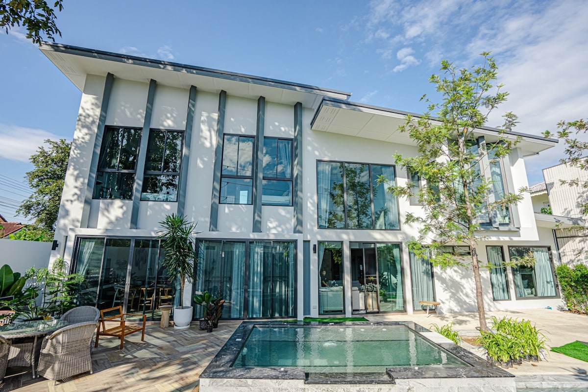 入住这处位于市中心的房源,让家人享受一切近在咫尺的便利。别墅以希腊圣托里尼的标志性建筑为灵感,尽情享受奢华和宁静。 我们的白色泳池可欣赏周围的迷人景色,别墅内部的色调为黑白色调,让您放松身心。 高雅与低调的主别墅设有设备齐全的厨房和宽敞的起居区域,所有家居为智能家居 ,应有尽有。 二、周边 别墅区位于清迈中心区JJ market 和尚泰商场 走路可达,,每个房间均配有洗漱用品及消毒用品、纸巾。周边分布各种菜系的网红打卡星级餐厅。门口有各国料理,🇨🇳🇯🇵🇰🇷🇹🇭🇮🇹🇪🇸🇺🇸 距离清迈网红餐厅5分钟车程;距离清迈塔佩门5分钟车程;距离清迈夜市5钟车程;距离清迈最大市场 7分钟车程;距尚泰百货购物商场,清迈机场10分钟, 三、五卧泳池别墅房型 能容纳14余人的聚会区,一层半超大客厅,超大露台 一个西餐厨房,私人泳池🏊,日光浴区🌞,烧烤区🍡,🍺可短租、日租、承接大型party🎉,聚会度假首选‼。一共配备6张床,其中4张king size 1.8mx2m的床,2张单人size 2x1.4m 的床,床垫均是美国进口以及超高规格的床品,让您睡的安心。