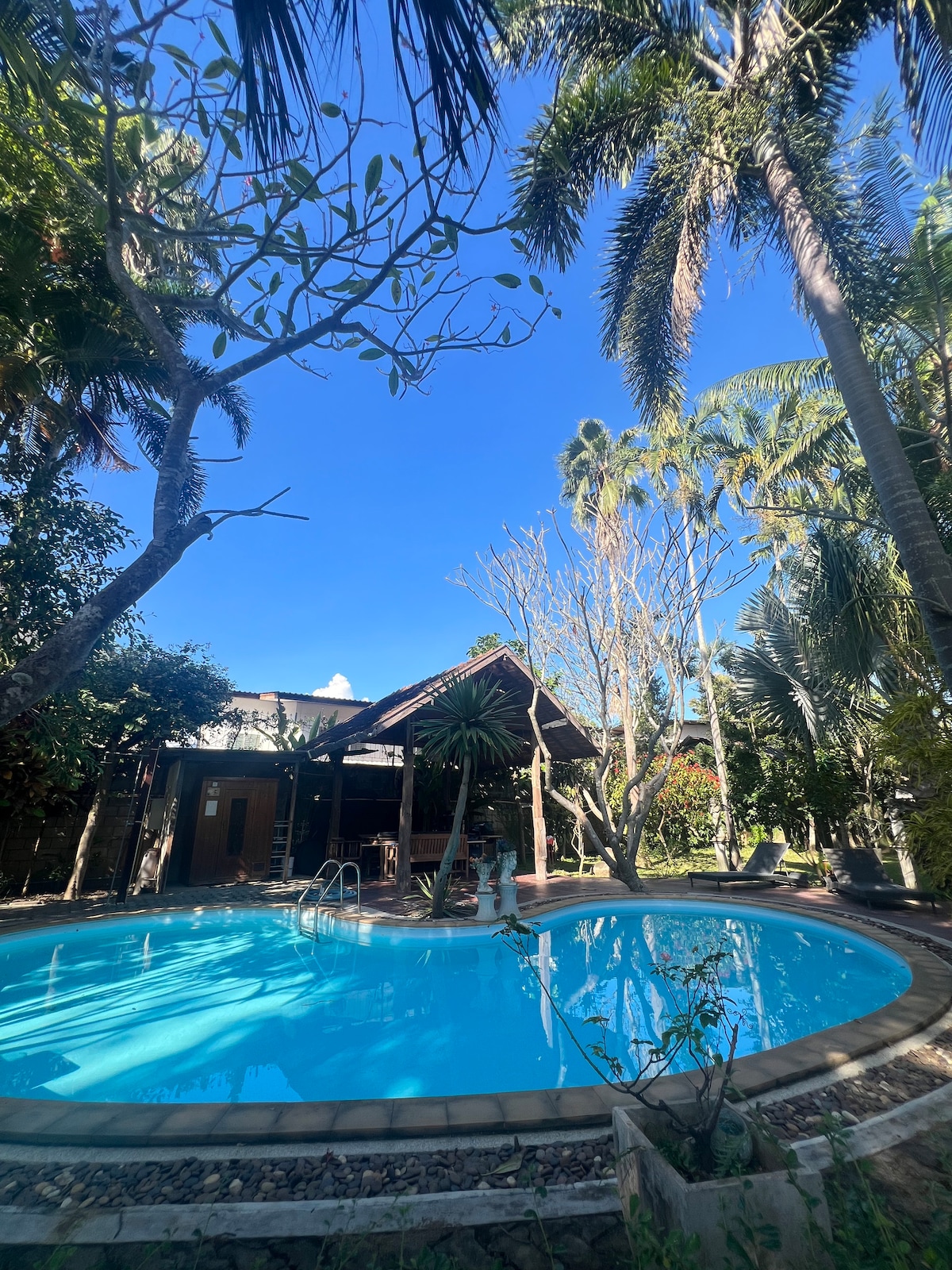 嗨!欢迎您来我家做客。我们很幸运地在市中心附近有一个大院子。这个木屋特别适合都市人来做短暂休息和放松,这里有非常适合放空的大花园和13米长的泳池。房子设计理念来自传统泰北农村的兰纳谷仓(二楼卧室、一楼存放生产资料、厨房及休息空间),我们在此基础把传统的房子改成更高空间、拥有更多采光,也在楼上楼下都配有洗漱卫生间。同时我们非常喜欢日式房屋内装的简约,所以做了融合。此外,房子里的古董家具和摆设都是我们过去几年在清迈所淘来,有些刚好和房子非常搭配,就随心地布置了。房子里的艺术画作均来自我孩子的父亲,他是本地艺术家。 如果您预定,将会使用整栋房子及花园和游泳池,房客会有独立的入口,另一侧是房东居住,因花园足够大,两个房子之间有20-30米距离,彼此都有足够的私密性。 抱歉,我们暂时不分开预定房间。 厨房提供全面的烹饪工具和厨餐具,还有洗衣机和烘干机。我们平时生活状态比较灵活休闲,周末可以带房客练瑜伽、徒步爬山、一起逛菜市场做泰餐、或一起玩水彩画画,如有兴趣,请主动给信号哦!