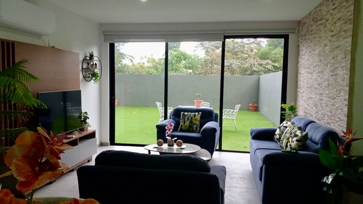 Un apartamento precioso, muy acogedor, funcional y completamente equipado con todo lo que necesitarás para que tu estadía sea placentera, segura y muy céntrica en San Salvador. El apartamento cuenta con: Aire acondicionado dentro y fuera de las habitaciones Sofás, cocina completa y sus accesorios Internet, SmartTV, Lavadora y Secadora para uso ilimitado Parqueo disponible Caseta de vigilancia 24/7 Ubicación privilegiada y accesible Cerrojo electrónico zona verdes para caminar y relajarse