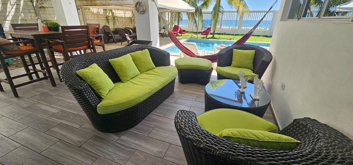 This beautiful beach house has direct access to the beach. An employee will be present at your disposal if you need something. The primary house has 3 bedroom with A/C & 2 bathrooms. Across from the pool is a private room with a fan and private bathroom. Esta hermosa casa de playa tiene acceso directo a la playa.Un empleado estará presente a su disposición en cuanto necesite algo. La casa principal tiene 3 habitaciones con A / C y 2 baños. Afuera hay una habitación privada con ventilado y bano.