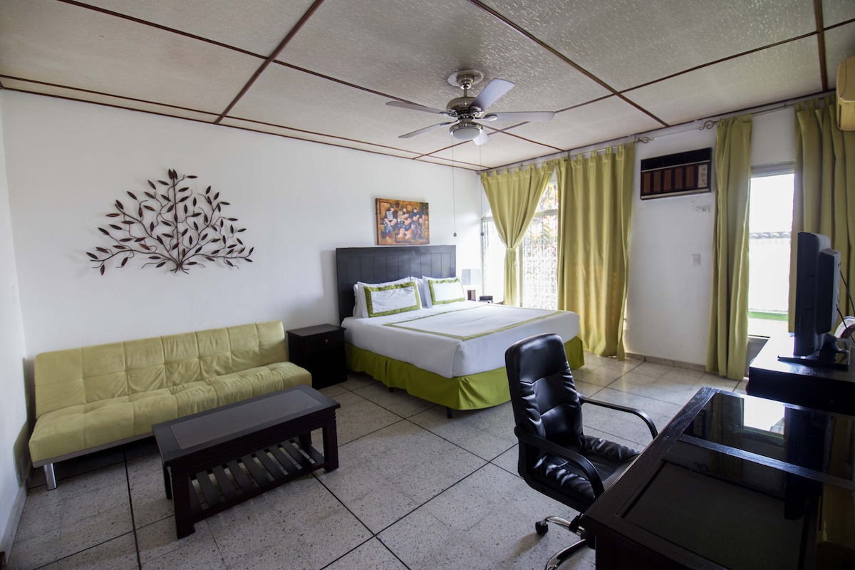 • Habitaciones amplias , equipadas con aire acondicionado, Smart TV con cable digital, closet, wifi, refrigerador, microondas, teléfono, sofá, escritorio, equipo de planchado, ducha con agua fría y caliente. Ubicado a 40 minutos del Aeropuerto Internacional, estamos situados en una de las principales vías de acceso de la Colonia Escalón (Calle El Mirador), con fácil acceso a los principales centros comerciales del país. A 5 minutos de Torre Futura y World Trade Center.