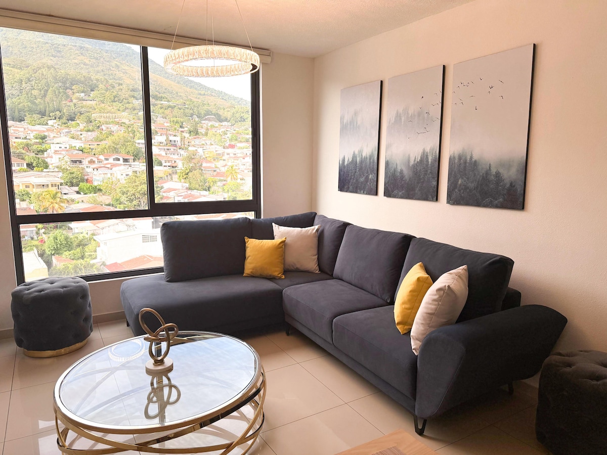 Apartamento con estilo ecléctico moderno en una de las zonas más exclusivas y seguras de San Salvador. Con una vista espectacular donde puedes observar el Volcán de San Salvador y parte de la ciudad. El edificio es nuevo y cada elemento que integran el apartamento están pensados en la comodidad del huésped para que su experiencia sea placentera y acogedora. Cada espacio es sanitizado y limpiado exhaustivamente luego de cada estadía.