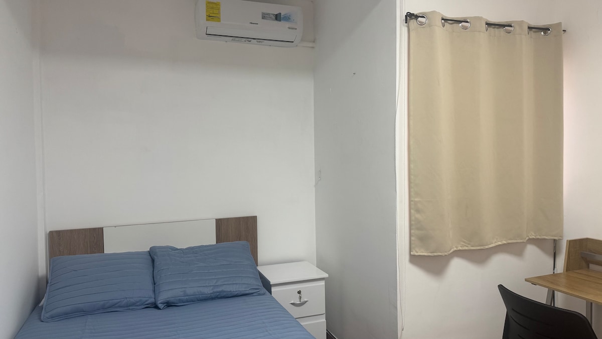 Disfruta de la sencillez de este alojamiento tranquilo y céntrico. La habitación cuenta con una cama matrimonial Smart TV con Netflix y hbo Max, baño propio, aire acondicionado,internet, incluye ropa de cama papel toallas.refrigeradora en área compartida. Disponible lavadora y secadora por un costo adicional ($5) La ubicación es accesible a centros comerciales, restaurantes, farmacias, supermercados, bancos, Atm, y muchos lugares más.