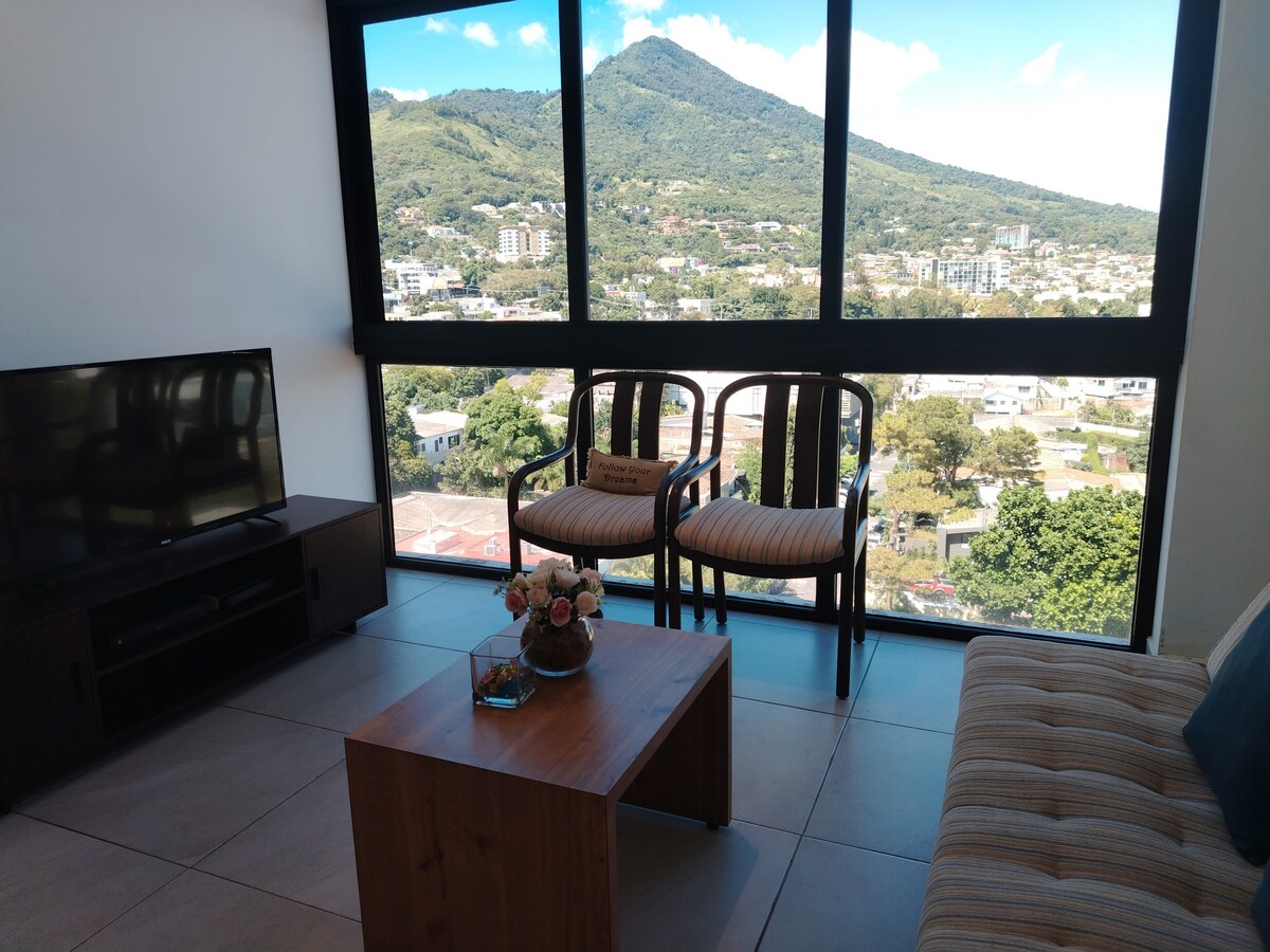 Apartamento con espacios amplios y bien iluminados, habitaciones con aire acondicionado y closet, Cocina con acabados de granito, terraza con una espectacular vista al volcán de San Salvador, Televisión con cable y Netflix, Internet inalámbrica. Cuenta con áreas sociales como: Terraza al aire libre, gimnasio, salon de usos múltiples y sala de reuniones. A una cuadra del Hotel Hilton, World Trade Center y Torre Futura