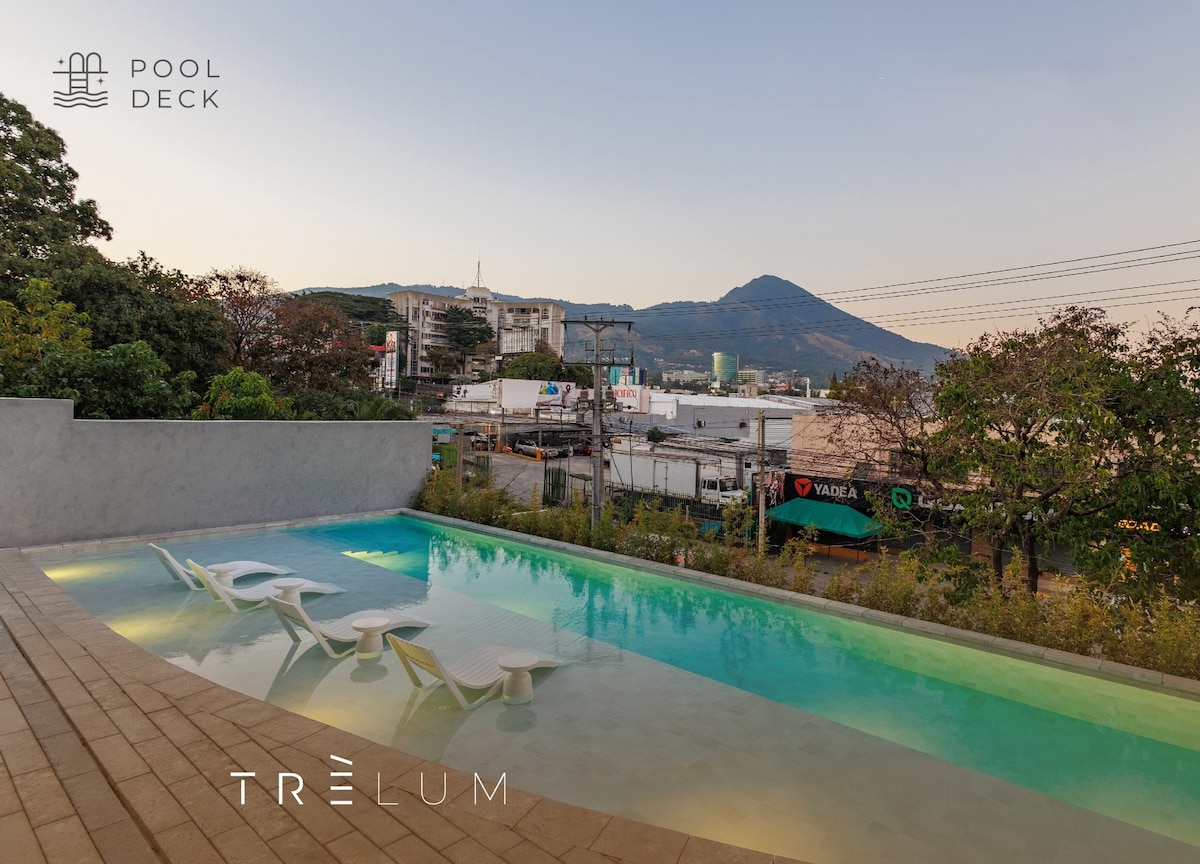Welcome to an apartment with a tasteful and dynamic concept, for an amazing stay. Located in one of the safest areas of the capital. The tower has a swimming pool, gym, social areas, playroom and rooftop available for guests (some with prior reservation). The apartment is located between 5 to 10 minutes from the best shopping centers, restaurants and exclusive bars. The apartment has an unbeatable view of the volcano and the city of San Salvador. Listing has a very easy self check-in mechanism