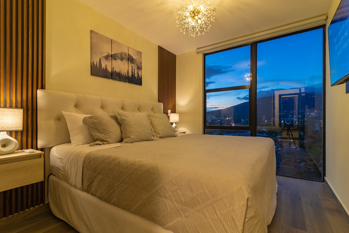 Modern apartment with stunning views of San Salvador Volcano, perfect for 2 guests. Includes 1 bed, 200 Mbps Wi‑Fi, and everything for a comfortable stay. Centrally located in a premium condo with 24/7 security, pool, gym, game room, outdoor cinema, climbing wall, and a sky lounge. Ideal for working remotely or enjoying a relaxing city escape!