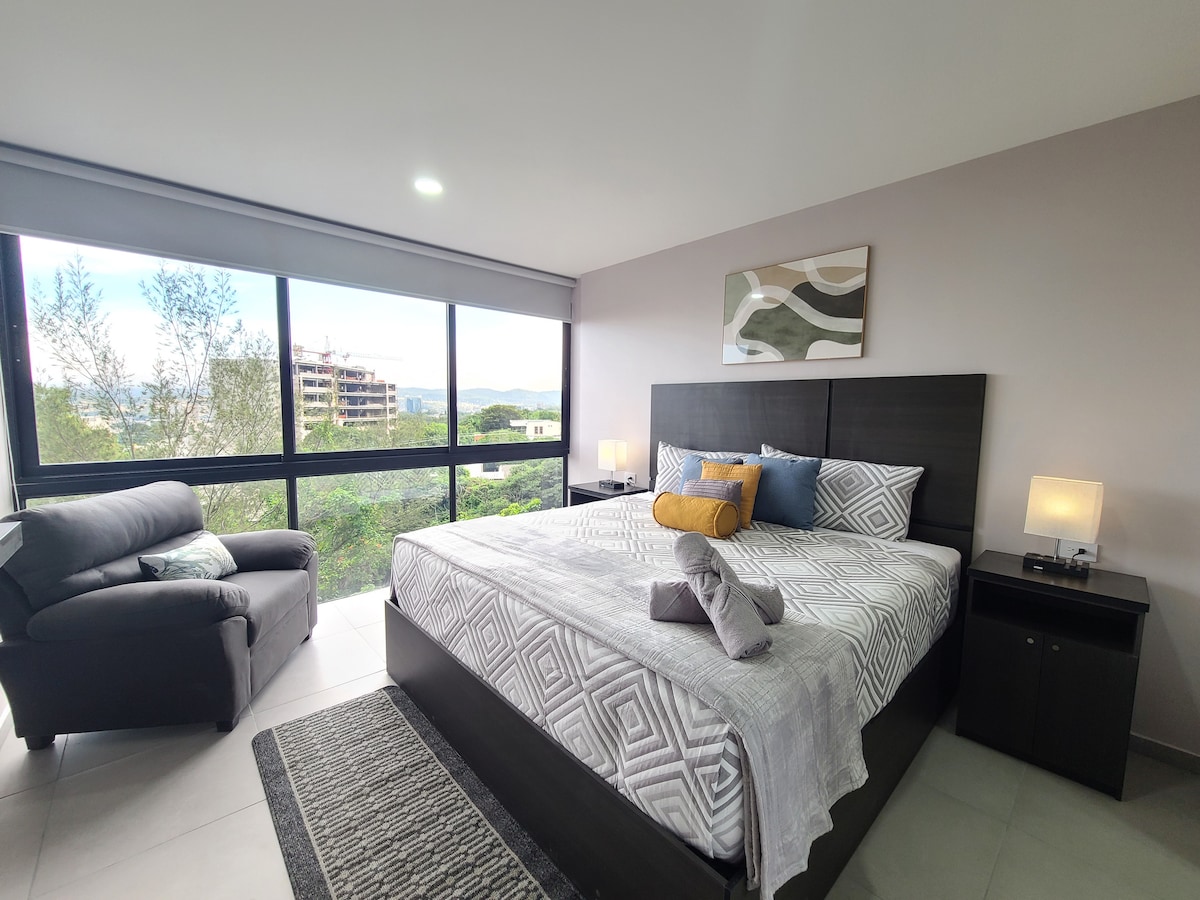 Descubre un apartamento en el corazón de San Salvador con vistas panorámicas asombrosas de la ciudad. Desde la majestuosa Catedral hasta el icónico Estadio Cuscatlán, cada detalle ha sido cuidadosamente seleccionado para brindar comodidad y un ambiente acogedor. En una zona residencial tranquila pero cercana a una animada área comercial, disfrutarás de una ubicación privilegiada con acceso estratégicos al aeropuesto y restaurates, etc. Te invitamos a vivir una experiencia única en San Salvador.