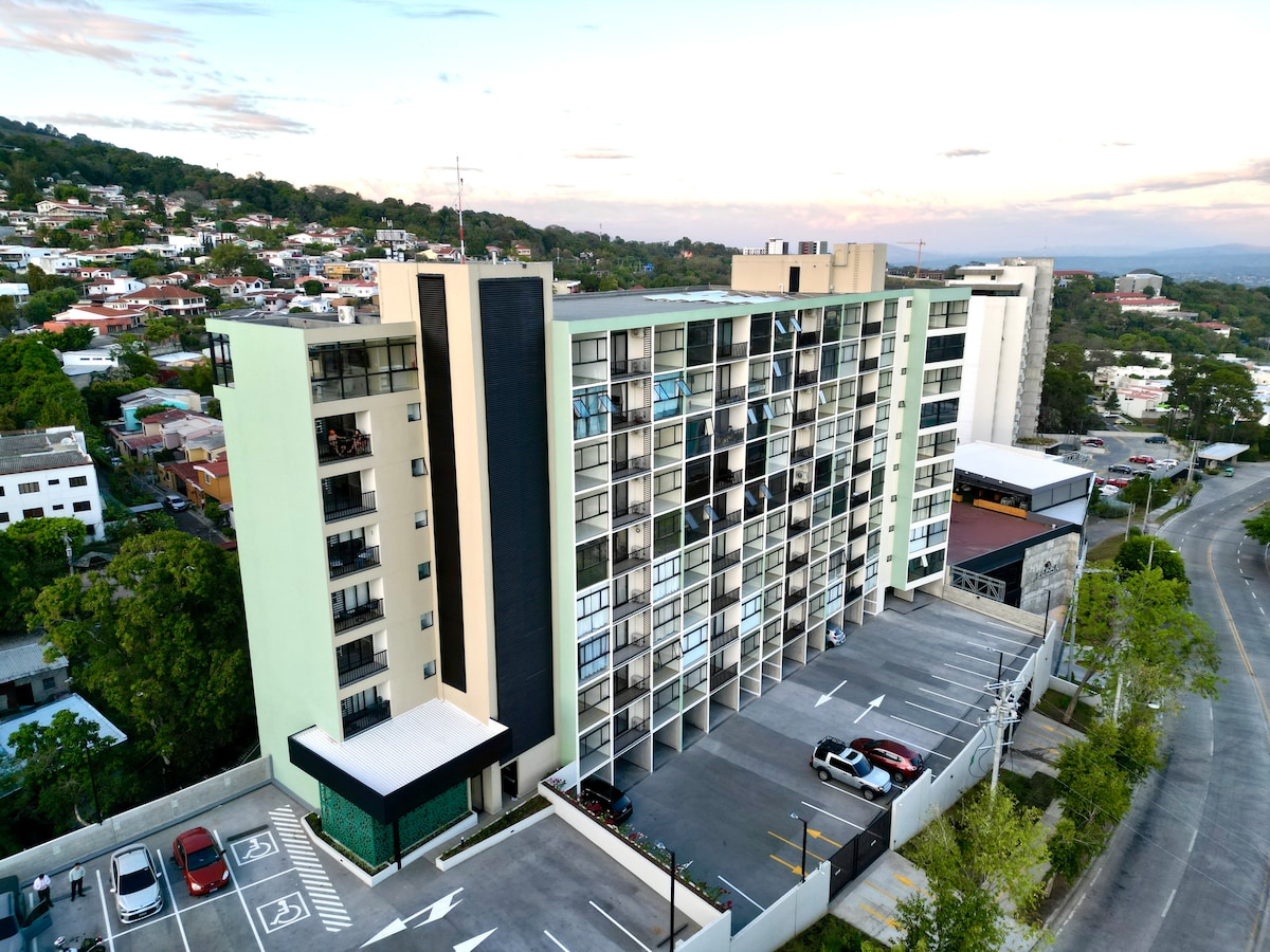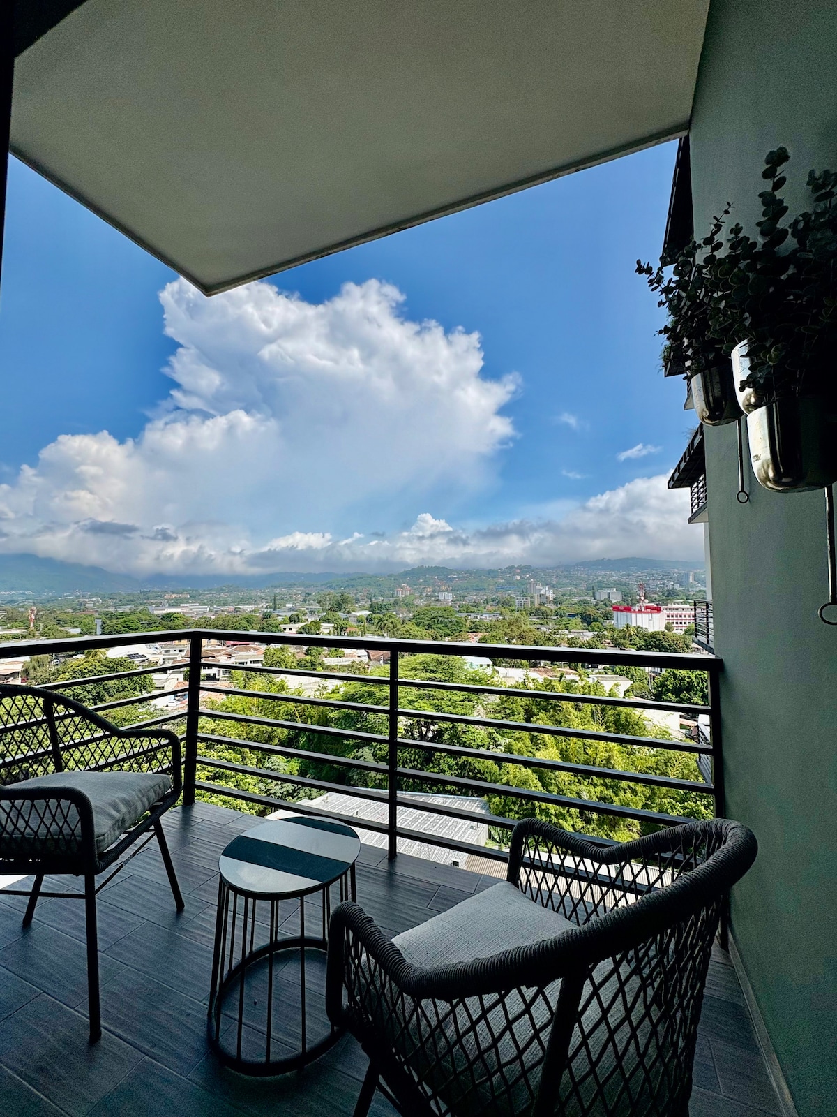 Moderno apartamento penthouse (último piso), 2 habitaciones full amuebladas, aire acondicionado en todas las áreas, amplia terraza con vista espectacular a la ciudad, WiFi 200 de MB, agua caliente, cocina completa, área de lavado y 2 parqueos privados. El edificio posee gimnasio, rooftop con vista 360, área de co working y área de juegos para niños. Zona residencial segura y céntrica rodeada de centros comerciales, farmacias, supermercados, estaciones de buses y gasolineras.
