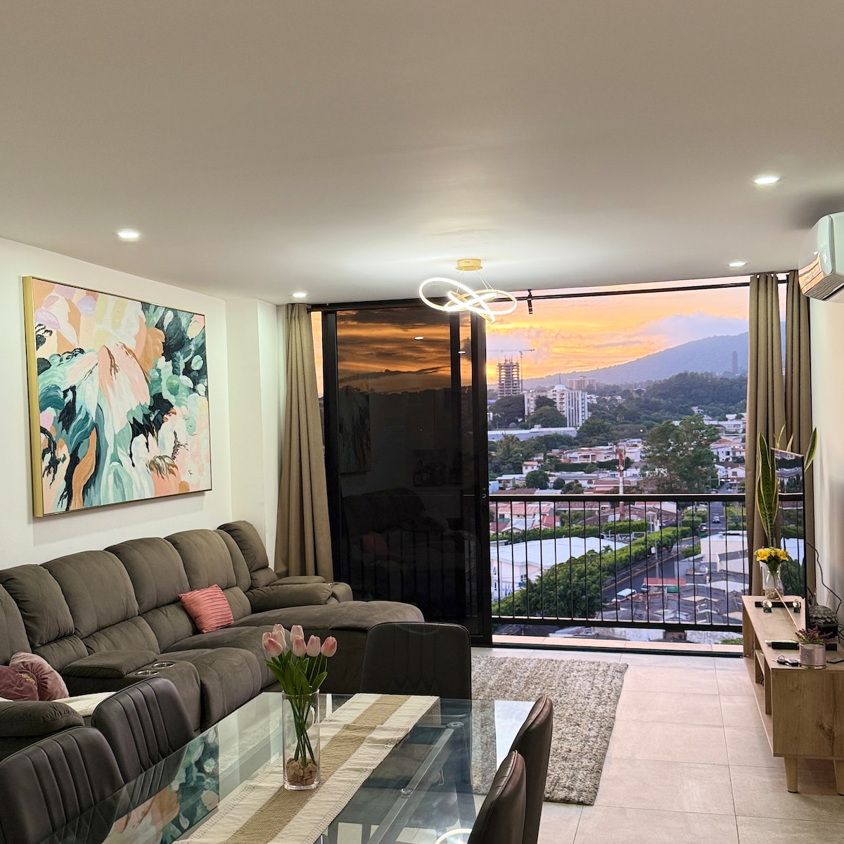 Cozy, spacious and modern apartment in a central area. It has a beautiful view of the city and the San Salvador volcano, since it is located on level 6. It is very well equipped with everything you need for a pleasant stay. With fast Wifi, TV, hot water, air conditioning, kitchen with everything you need. Pool on rooftop. Perfect for families Very well located, less than 5 minutes from the largest shopping centers, restaurants and bars. Safe and exclusive area.