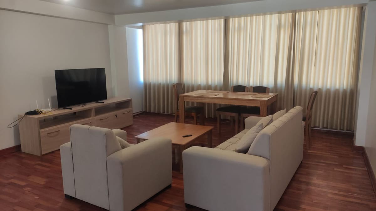 Only 10 minutes by car from the Historic Center of Cusco and the airport, this modern apartment offers comfort in a safe and quiet residential area, with easy access to main avenues, shops, and restaurants. It features fast WiFi, a strong hot shower with 24-hour hot water, and very comfortable beds for a great rest. The apartment also includes a fully equipped kitchen, washing machine, and an electric heater for extra comfort during your stay.