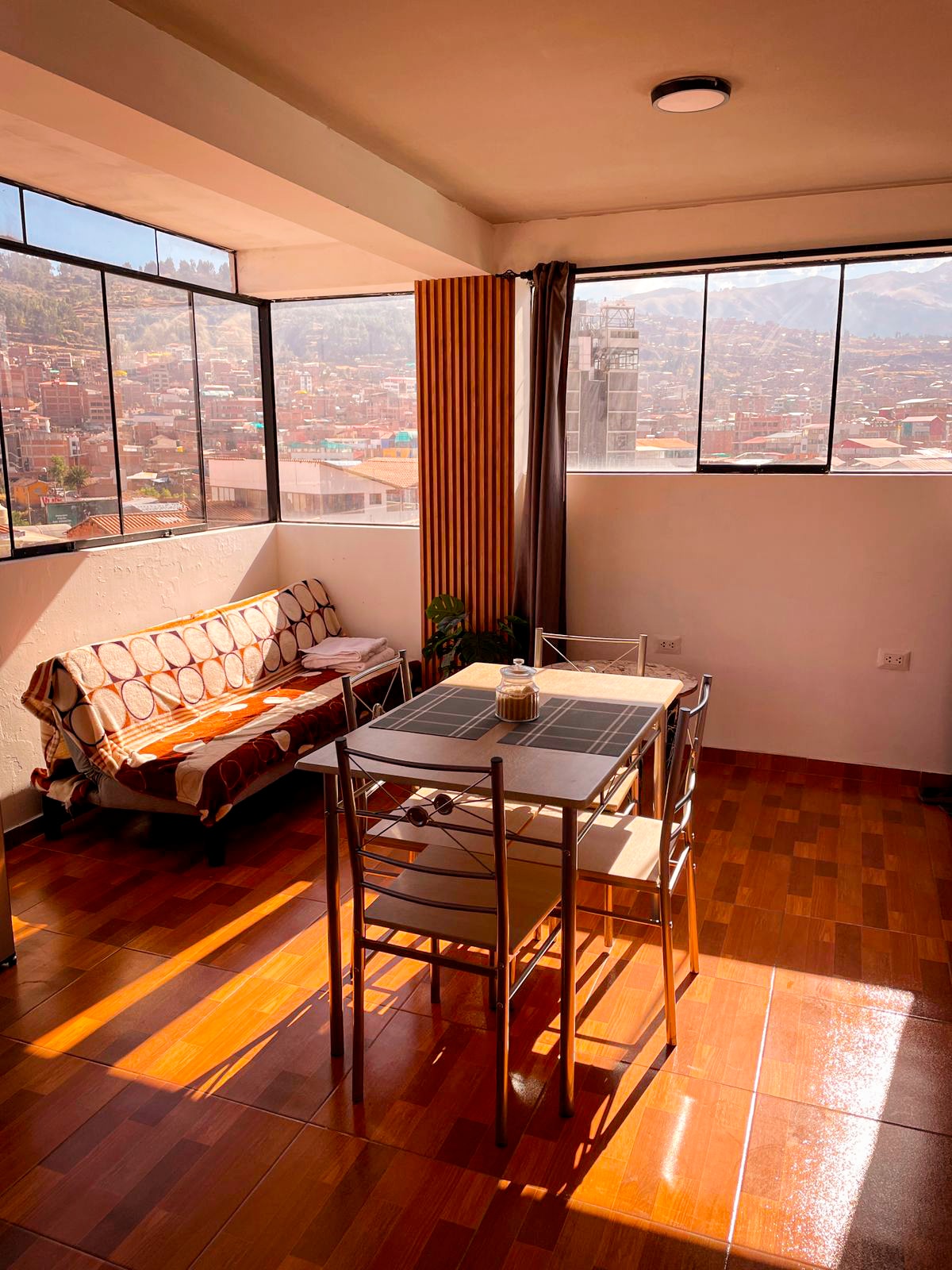 Moderno y confortable studio ubicado en una zona céntrica de Cusco, donde podrás encontrar muy cerca supermercados, restaurantes, farmacias, entidades bancarias y financieras, casas de cambio, clínicas de salud y otros, decoración moderna sencilla, funcional, acogedor y bien iluminado. Sala con Wifi, Netflix, Cable mágico, sofá confortables, kitchenette totalmente equipado, ducha con abundante agua caliente las 24 horas, terraza con sombrilla y vista panorámica de la ciudad.