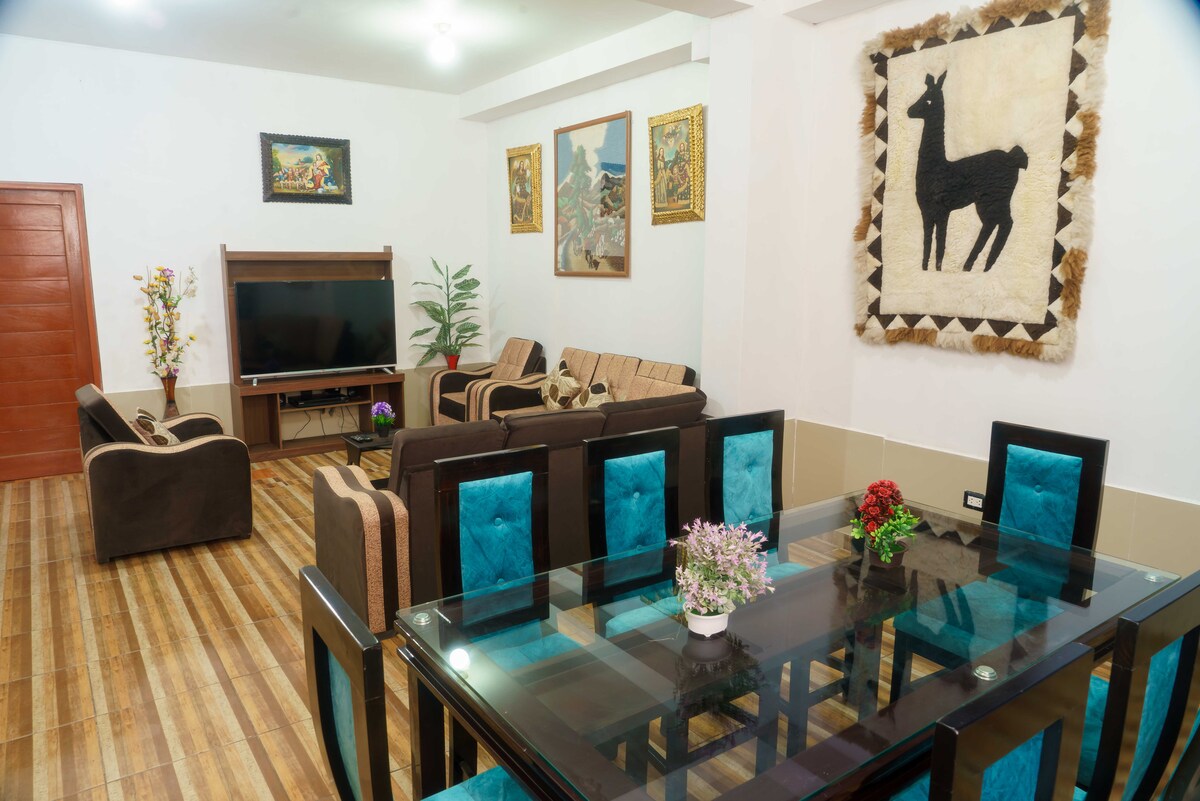 Amplio e iluminado apartamento de dos comodas habitaciones. Cuenta con un espacio dedicado para el trabajo, cocina equipada y cómoda sala-comedor. Adicionalmente, puedes acceder a las areas verdes, donde puedes descansar o hacer uso de la parrilla. Está localizado a 10 minutos del aeropuerto, a 15 minutos de la plaza de armas, y podrás encontrar alrededor muchas tiendas y restaurantes. Los anfitriones estaremos disponibles todo el tiempo, atentos a que tengas la mejor experiencia en Cusco.