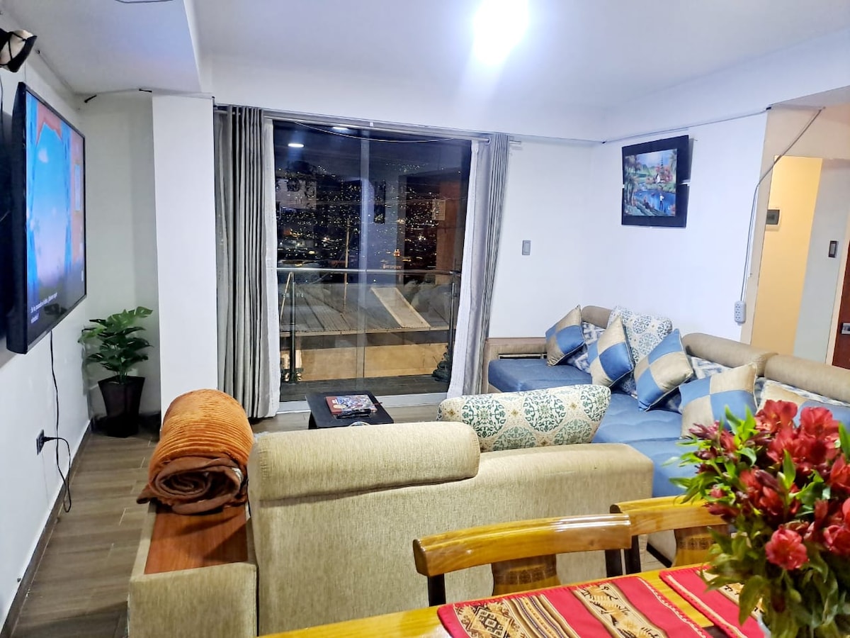 Apartamento Exclusivo en la ciudad del Cusco, ubicado en el barrio de Balconcillo a 15 minutos del centro de la ciudad y a 20 minutos desde el Aeropuerto en taxi. Cerca del Barrio de San Blas. Apartamento moderno y amplio con todas las comodidades Sala, Cocina, Comedor, 03 Habitaciones, 02 Baños, Lavanderia, completamente equipado con articulos de buena calidad; Vista Panorámica y hermoza de la Ciudad del Cusco; ideal para familias, grupo de amigos. Somos su mejor opción en el Cusco.