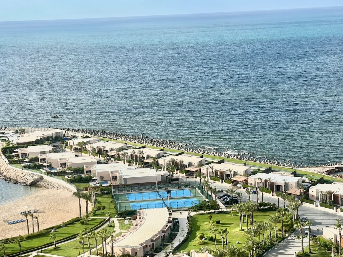 Luxurious apartment in the prestigious Four Seasons Alexandria. Features a master bedroom with king-size bed, ensuite bathroom, walk-in dressing room, and sea-view balcony. Second bedroom has two single beds and sea views. Spacious living room, dining area, fully equipped kitchen, laundry room, and a separate full bathroom. Enjoy luxury hotel services, private beach and pool access, shopping, and entertainment within the building. No electricity cutoffs for uninterrupted comfort.