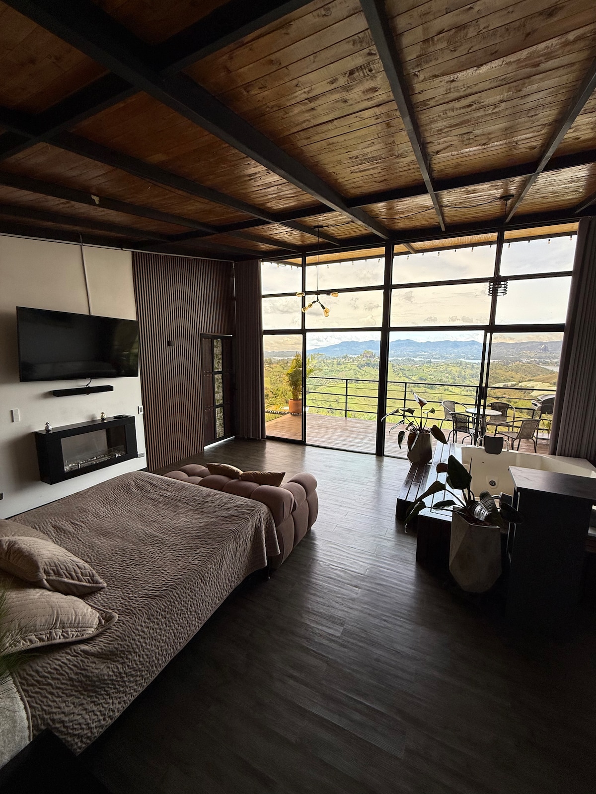 Sumérgete en una experiencia única en nuestra cabaña de lujo en El Peñol, con una vista inigualable al embalse y La Piedra; rodeada de naturaleza y montañas. Disfruta del jacuzzi privado, relájate en la malla catamarán, prepara tus platos favoritos en la cocina equipada o en la zona BBQ, y mantente siempre conectado con nuestro Wifi de alta velocidad. Un lugar diseñado para el descanso, la comodidad y la desconexión en pareja o familia.