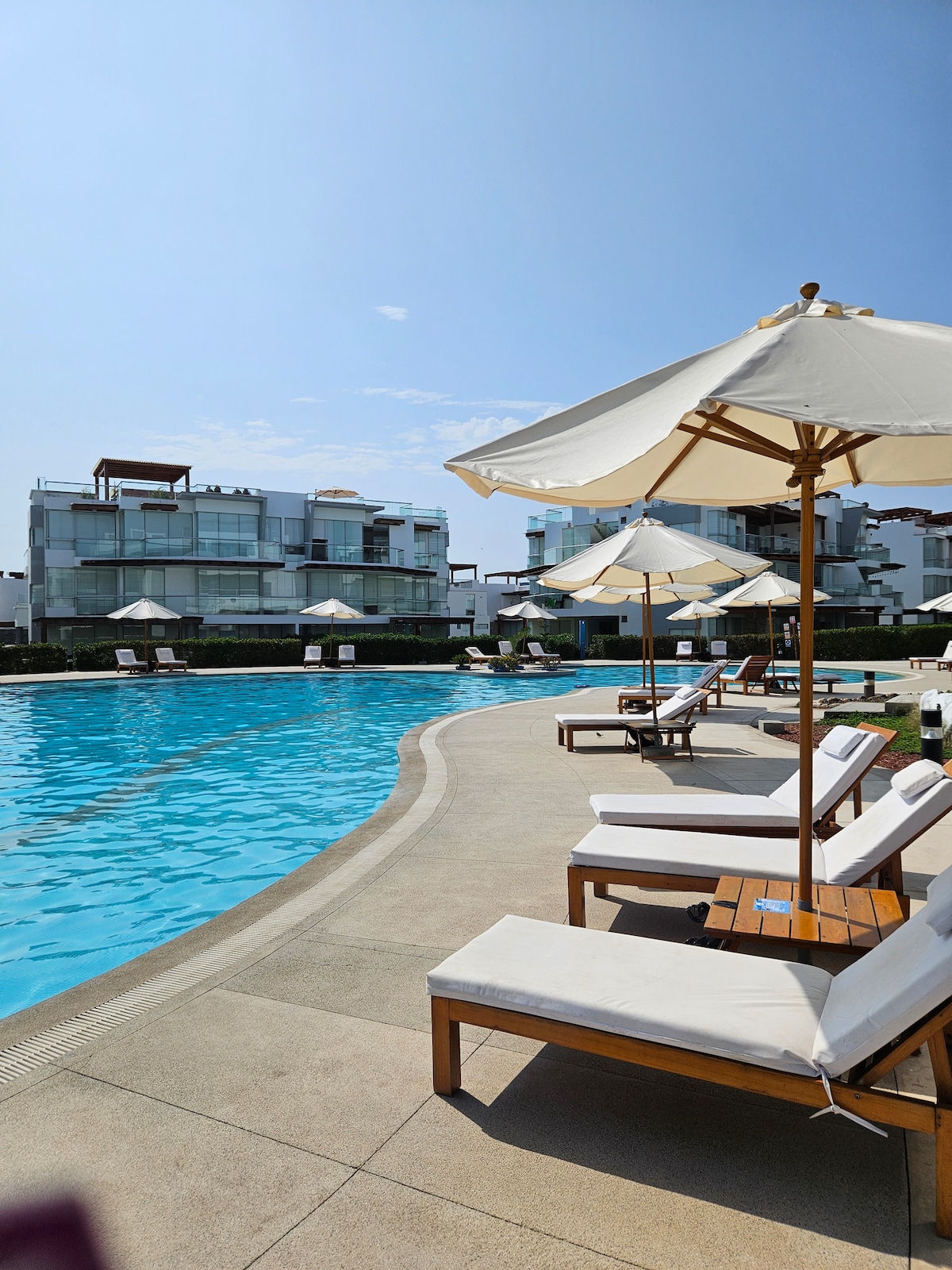 Enjoy a relaxing stay in this modern furnished apartment in Playa Mikonos, Asia. It features a private pool, barbecue, and parking, ideal for up to 4 guests. Located on the second floor, with 85 m² of well-distributed space. Layout: • Master bedroom with double bed • Second bedroom with two single beds • Two full bathrooms • Private pool • Terrace • Barbecue • Fully equipped kitchen: 4-burner stove, microwave, refrigerator, oven, and range hood • 50" TV in the living room • Bed linens included
