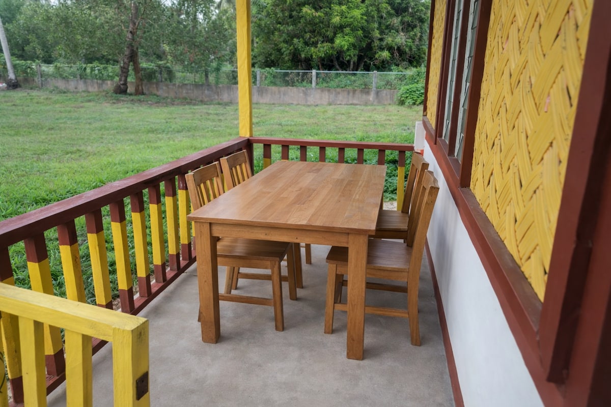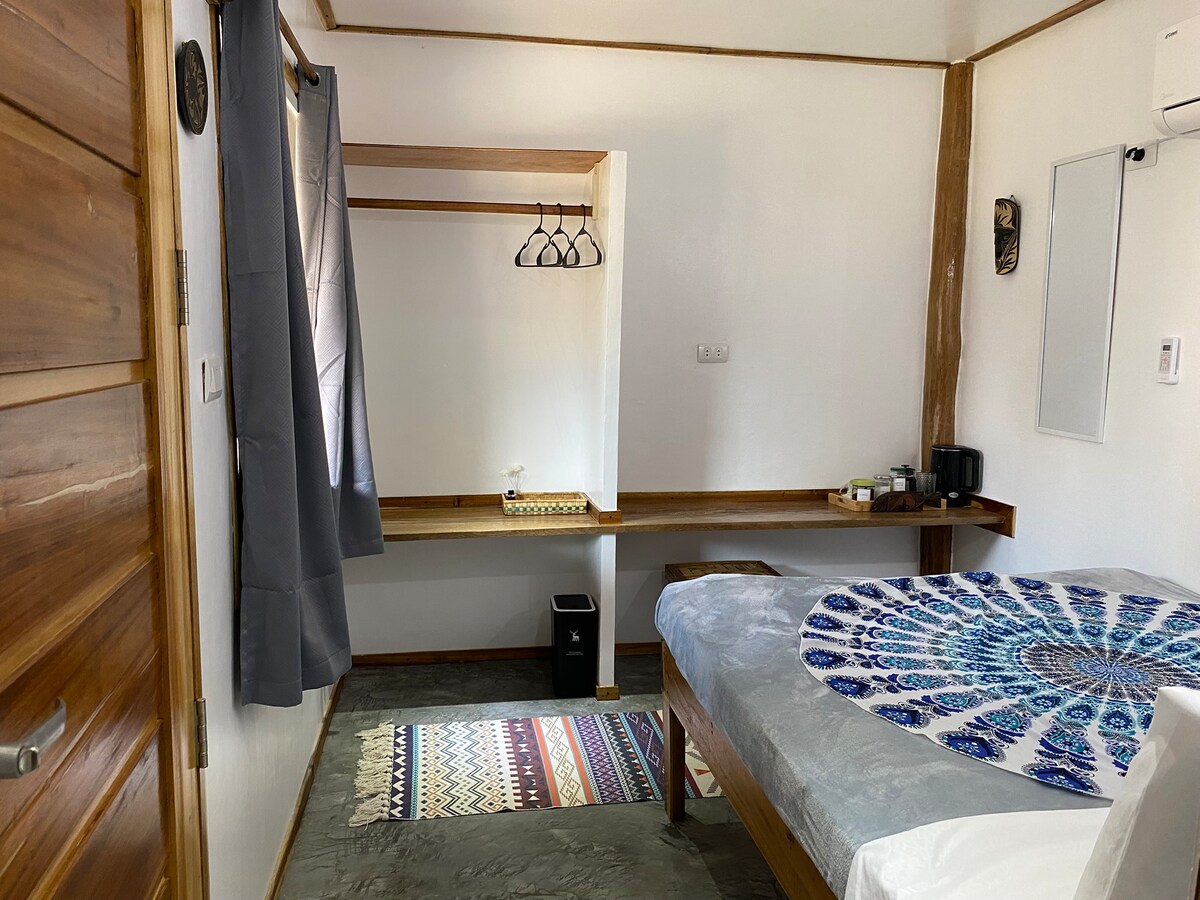 This place is absolutely lovely, new with beautiful wooden architecture and 2 minutes walk to the beach. Fitted with tiled flooring, air conditioned, fan, and mini refrigerator. The unit features a private bathroom, equipped with bidet, hot/cold shower and free toiletries. Coffee and tea are served in the morning for free. Electricity is available 24 hours with high speed internet.