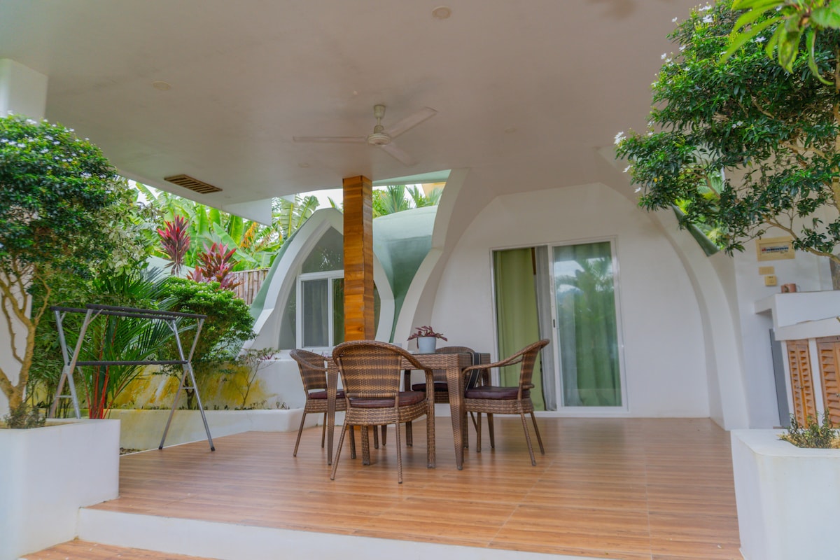 Amplias, cómodas y luminosas villas privadas sin cocina con 25 m2 de interior, una terraza privada de 20m2 y 10 m2 de jardín privado. terraza con zona chillout para 4 personas con vistas hacia el jardín privado des de el cual podrán acceder directamente a la piscina. Villa privada es ideal para aquellos que buscan un espacio amplio y abierto para disfrutar de su estancia. Diseño se inspira en la naturaleza de la zona, con murales que simulan la vegetación y acabados en madera.