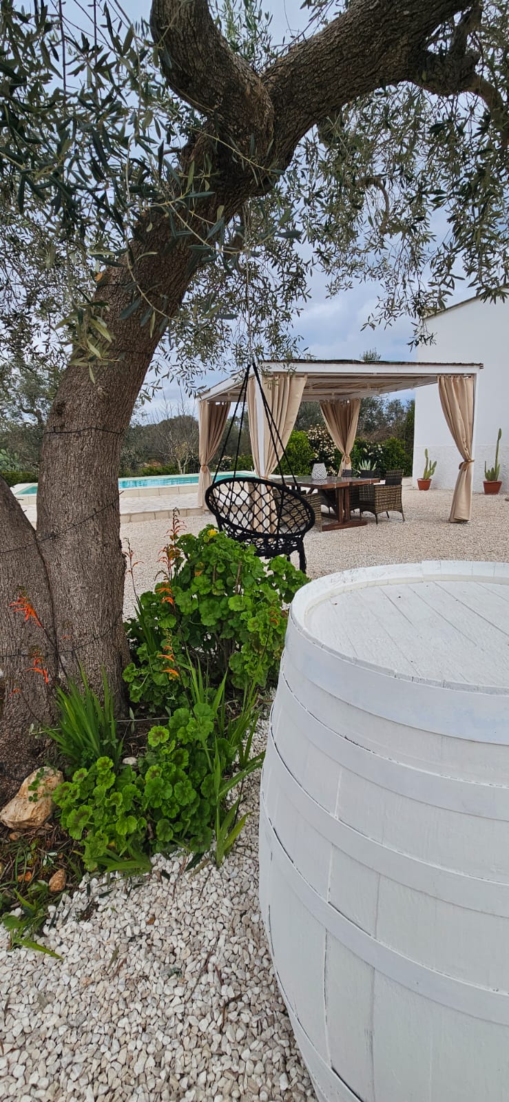 The property is made up of the main house, the trullo and vaulted stone annex. The house can sleep 12. The extra large 12m by 6m pool is lined by a long seat with double mattresses for comfortable lounging. The layout allows for family groups to enjoy their own private room spaces. When its time, everyone can come together under the huge gazebo, perfect for entertaining, relaxing, eating, drinking. The outside kitchen is impressively equipped with wood fired oven and charcoal grill.