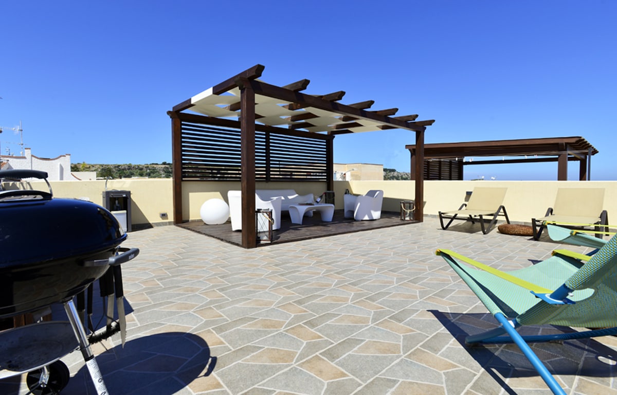 L'appartamento moderno e funzionale di recente ristrutturazione è finemente arredato e corredato per ospitare comodamente fino a 6 persone. La terrazza di pertinenza ed uso esclusivo ed il suo pergolato forniscono un valore aggiunto per chi volesse fruire di un solarium e dove potere passare piacevoli serate fruendo del barbecue.Posto nel centro storico del paese appena fuori dalla zona pedonale, dista 350mt dalla spiaggia, nelle immediate vicinanze supermarket, agenzia servizi e fermata pullman