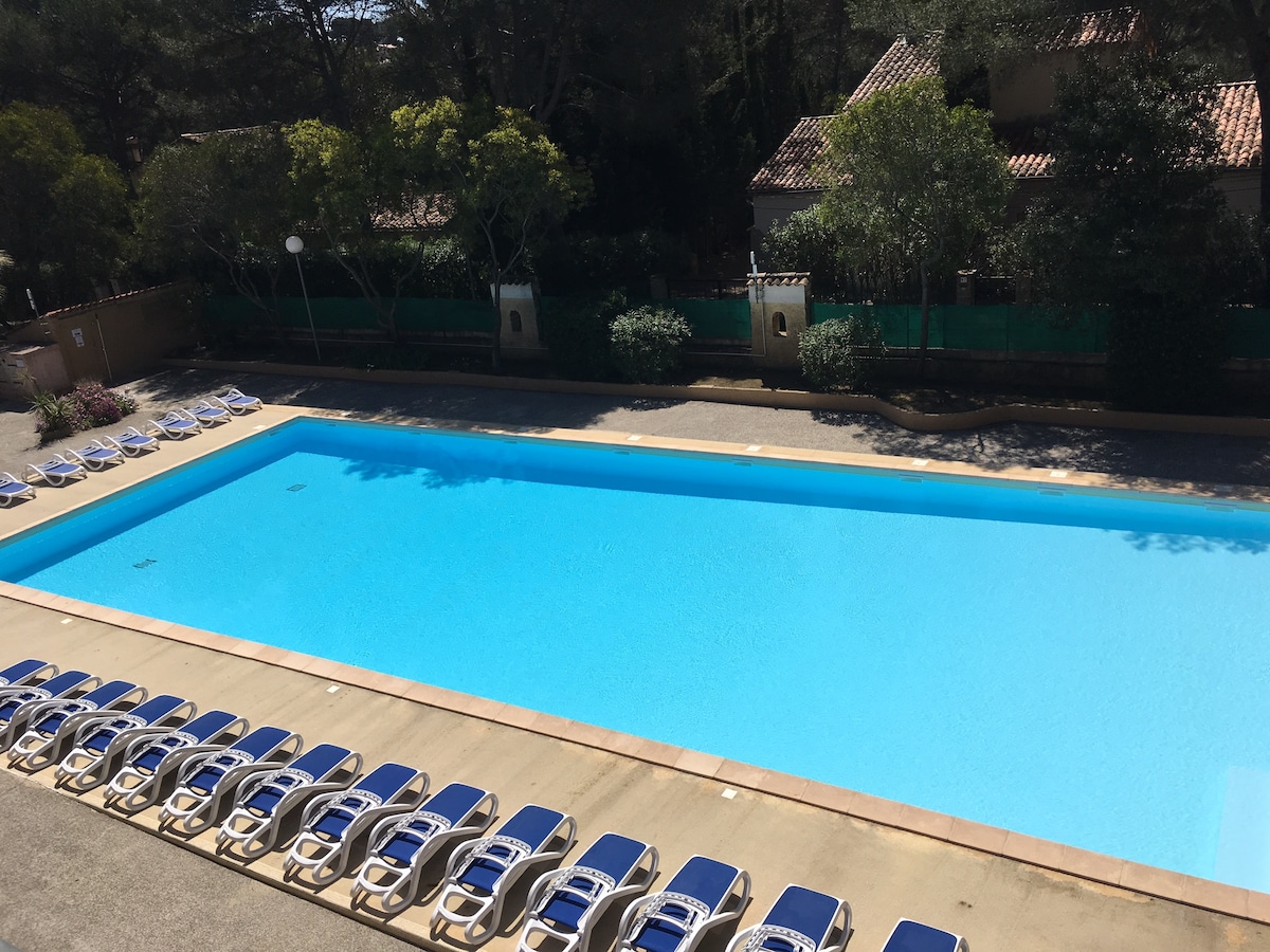 Joli appartement refait à neuf et climatisé, au 2ème étage (sans ascenseur) d'une résidence arborée avec piscine. Idéalement situé à Sanary-sur-Mer, entre la gare (12 min à pieds) et le port (15/20 min à pieds). Résidence sécurisée. Une place de parking est mise à votre disposition gratuitement. Vous pourrez venir y séjourner en amoureux, en famille, entre amis ou lors de vos déplacements professionnels. L'accès à l'autoroute se situe à seulement 2 min en voiture.