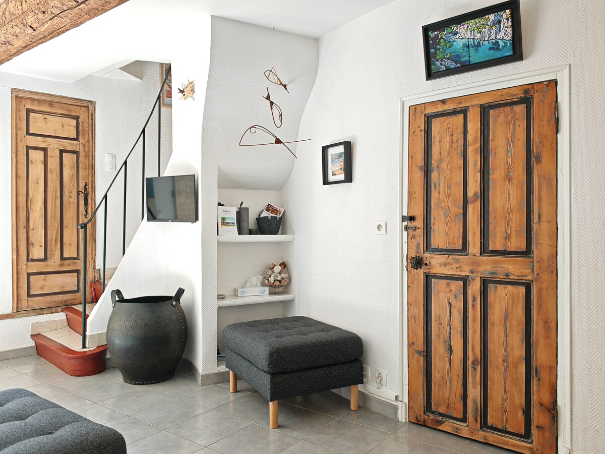 logement familial proche de toutes commodités, Petite maison individuelle atypique 45 m2 , classée 3* ,très CALME , pour 4/5 pers, à 20 m de la mer , située au pied d’une falaise naturelle, entièrement sécurisée et caractéristique du paysage de la Corniche des Baux À l’intérieur une paroi rocheuse apparente a été conservée Elle est en duplex au 1er étage cuisine séjour canapés couchage quotidien douche à l’italienne wc Au RDC 1 chambre douche à l’italienne, wc Un patio pas de vue mer