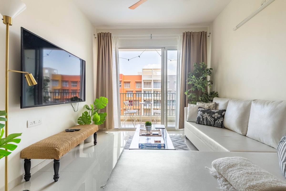> 1 BHK Apartment: Spacious layout, perfect for comfortable living. > Large Balcony: Offers a serene, open sea view with seating arrangements, ideal for relaxation. > Cozy Living Room: Includes modern furniture & a dining table. > Well-Equipped Kitchen: Microwave, kettle, induction cooktop & more. > Natural Light: Large glass doors and windows allow sunlight to brighten the space. With full access to resort style amenities including swimming pool, billiards table, games room & more.