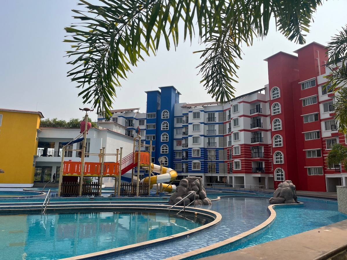 This is an aparthotel having 24 apartments with swimming pool, common dining & play area nestled in greens. Your apartment is approx. 720 sq.ft. Separate bedroom, living, kitchenette, sofa cum bed, bathroom, toiletries, 2 balconies. Color of furniture and interiors may vary as per availability. We are located 5/10 minutes by bike or car from the beautiful beaches of Majorda, Betalbatim, Colva, Utorda and best eating joints like Martins corner, Pentagon, Cota Cozinha,, Juju, Folga, Jamming Goat.