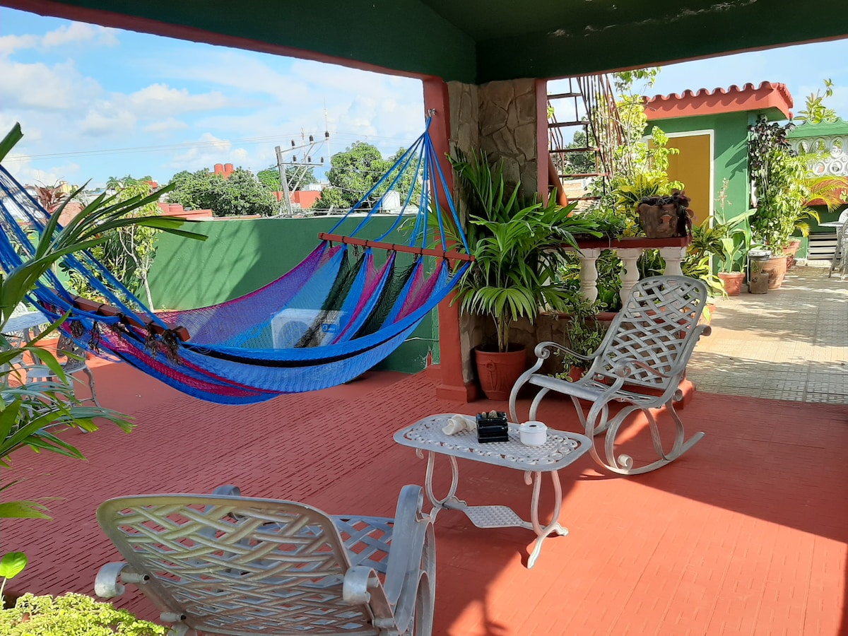Espacio totalmente para los huéspedes, en planta alta, con dos habitaciones amplias claras y ventiladas, con una terraza común, donde ofertamos los desayunos(5 euros por persona) y ricos cocteles, con entrada independiente desde la calle Frank País. La primera habitación tiene dos camas matrimoniales y la segunda habitación tiene una cama matrimonial y2 personales,cada una con su baño privado. Es perfecta para familias, parejas o grupo de amigos.