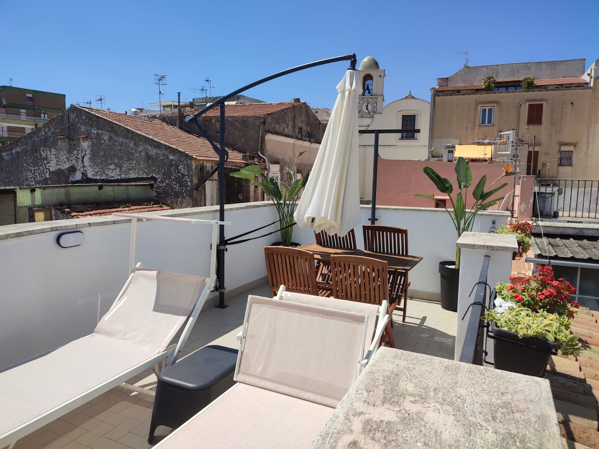 Signorile attico sito in prossimità del corso principale della ridente Gaeta, perla del golfo che ne prende il nome. La posizione dell'appartamento è al contempo sia centrale sia lontana dai rumori cittadini, per garantire un assoluto relax! Al piano terra, nel cortile dotato di cancello automatico, è a disposizione dei nostri ospiti un comodo posto auto all'ombra. Il punto di forza dell'attico è senza dubbio il suo terrazzo a livello con una vista mozzafiato sul golfo!! Vi aspettiamo