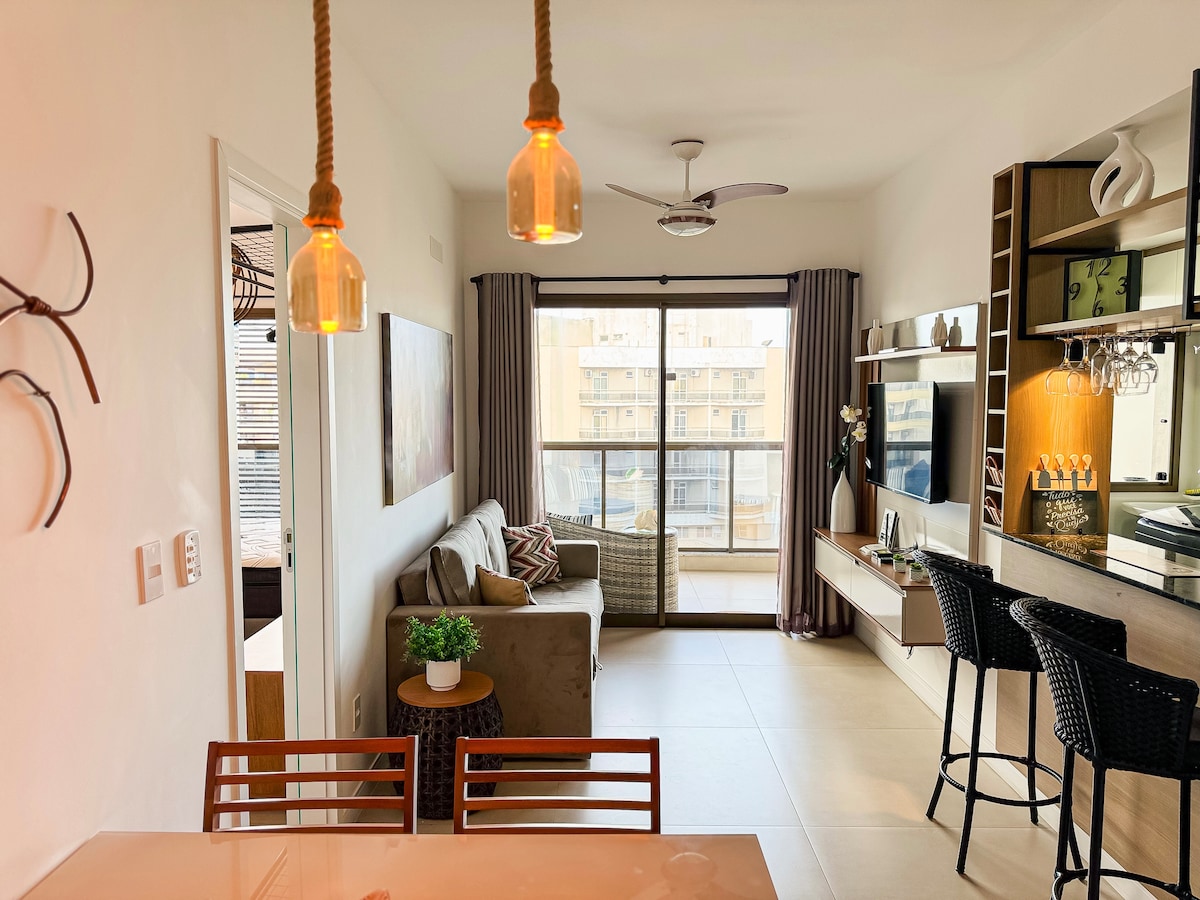 Você vai amar! Local estratégico. Avista parte da enseada, dunas, as montanhas de Arraial. Iluminado, ventilado, moderno, 92 m². Acomoda confortavelmente 5 pessoas, 1 cama queen e 1 solteiro no quarto e 1 cama de casal na sala. Conceito aberto na área social, sensação de bem estar em 3 amb climatizados, cozinha planejada . Varandão com sofá, mesa e churrasqueira. Amplo banheiro com banheira sem hidro. Banheiro auxiliar. WiFi, smart TV. Sol da manhã. Ideal família, 2 vagas.