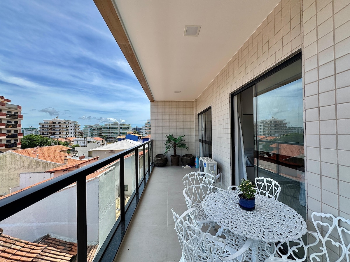 Apartamento novo, moderno, sol da manhã, ventilado, 03 banheiros, 02 vagas de garagem e a 200 metros da praia, no melhor ponto de Cabo Frio! Apartamento todo avarandado com vista para o mar! Quartos e sala amplos com ar condicionado e ventiladores! Suite com 01 cama de casal box Queen e uma cama solteiro Quarto hóspedes com 02 camas box solteiro,sendo 01 bicama. Tudo o você precisa para ter uma estadia maravilhosa! Vejam a nossa avaliação!
