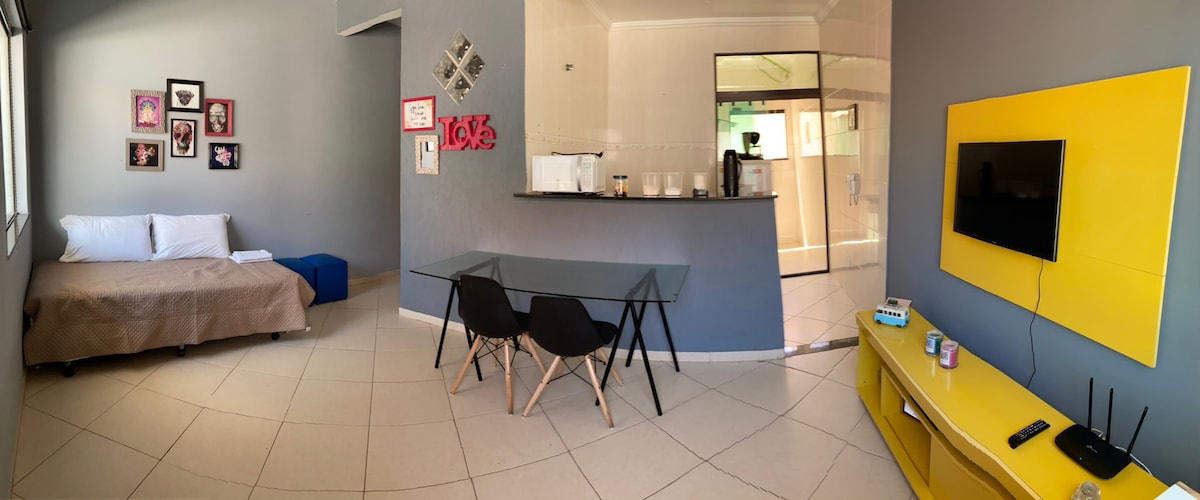 Cozy beach house, all renovated, with a suite and a living room with two king size sofa beds, full social bathroom, well equipped kitchen and a parking space for one car in the condominium. Besides being close to the beach (2 blocks), it is close to a good trade (bakery, pharmacy, supermarket, restaurants, etc) and 1 km from the bus station. The house is great for couples and families with children.