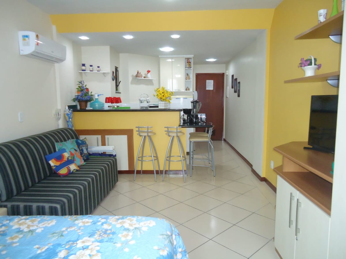 Apartamento tipo Loft com 30 m2, conjugado (não possui quartos), com cozinha americana, banheiro no apartamento. Cama de casal e 2 sofás-camas de casal (LER o item OUTRAS INFORMAÇÕES IMPORTANTES), televisão de 32', armário, geladeira, microondas, fogão, panelas, panela de pressão, cafeteira, liquidificador, sanduicheira, ventilador de teto (NÃO POSSUI AR CONDICIONADO, pois na maior parte do tempo há forte brisa do mar). Garagem (com limitação de vagas e manobrista na alta temporada e feriadões).