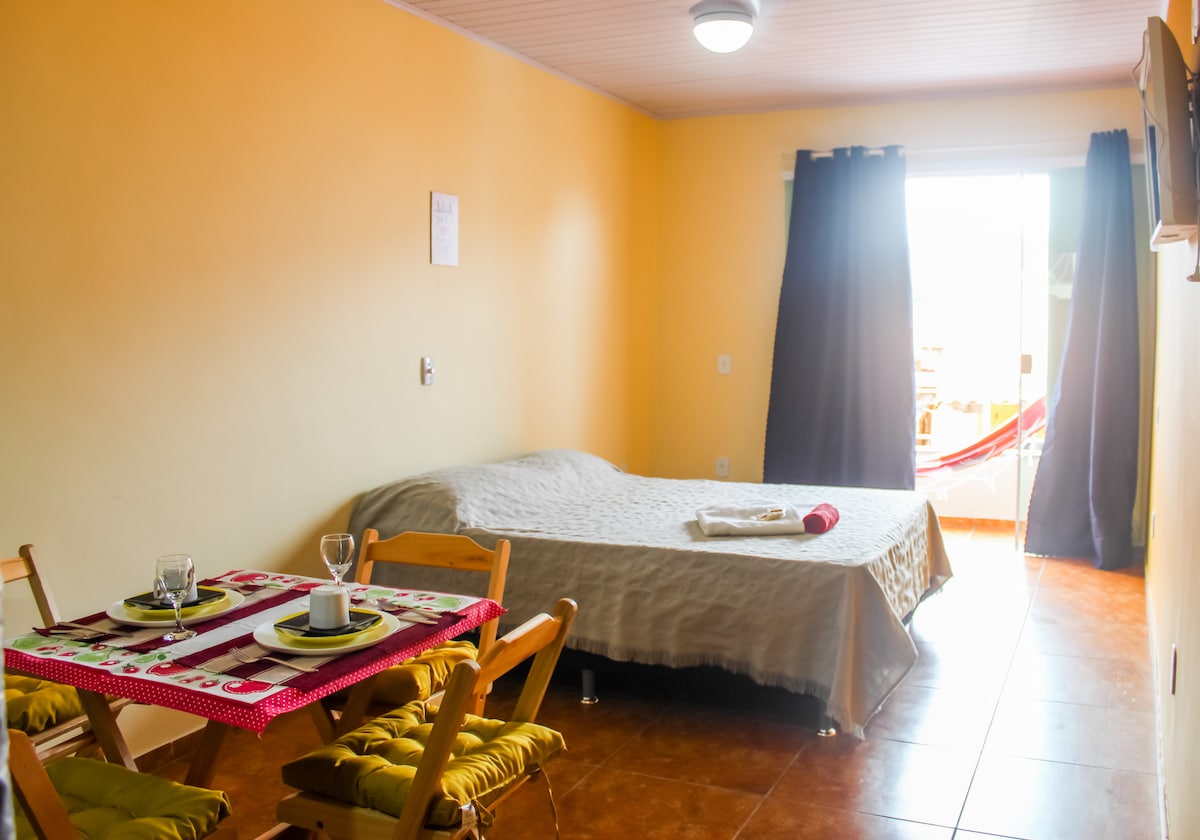 Flat com cozinha e banheiro privativos (só voces usam) com internet, TV 32'' , roupa de cama inclusa, localizado a duas quadras da praia, com ventilador de teto e ventilador de mesa 40 cm., Cooler que pode ser usado levando suas bebidas para praia, possui uma pequena varanda e rede de descanso, equipado com ferro elétrico, cafeteira, microondas e secador de cabelo Para acessar o Flat necessário subir uma alameda de uns 20 metros..