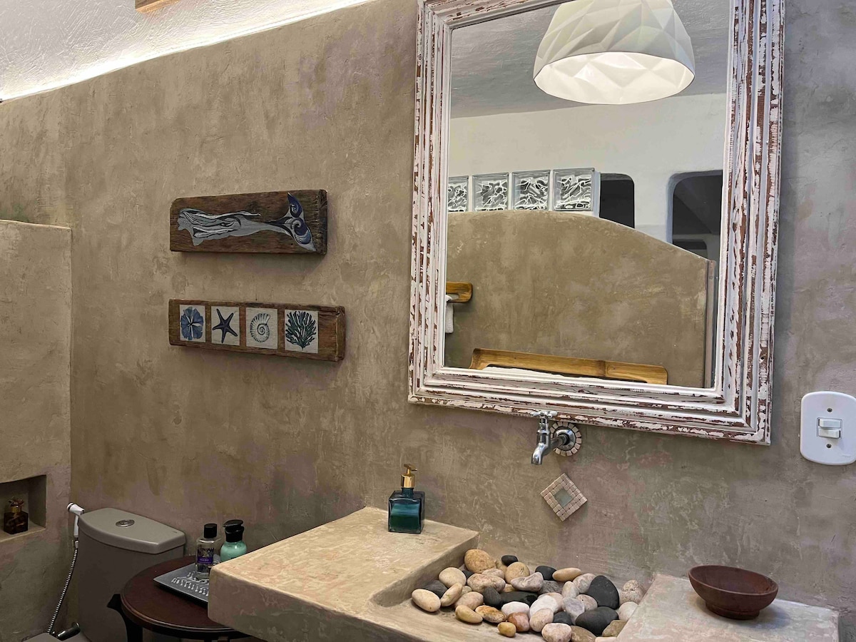 A hospedagem corresponde a casa de hóspedes, com quarto, sala, banheiro e cozinha gourmet na área externa, com churrasqueira, fogão e geladeira. O imóvel se encontra dentro do loteamento Águas Claras, próximo da igreja Católica de São José e da escola Regina da Silveira. O imóvel fica a 5 minutos de carro da praia do Manguinhos e Tucuns. Fica também a 10 minutos de carro da praia do Geribá. Para quem gosta de caminhar, a praia fica a 25 minutos, a pé da praia do Manguinhos.