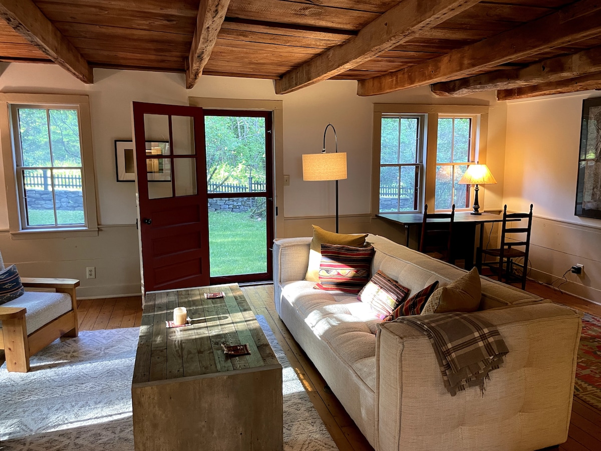 The Writer's Cottage is a tiny white house on a country road; vintage, complete, and inspiring. Built in the nineteenth century, it's perfect for a solo traveler or a pair of travelers exploring the Berkshires and the Hudson Valley. If you like rustic buildings, you'll be a fan of the cottage; it's an incredibly cozy time warp. Queen bed and living quarters downstairs; airy loft up a narrow set of enclosed stairs. There's an orchard and lawn with grill, hammock and ironwork table.