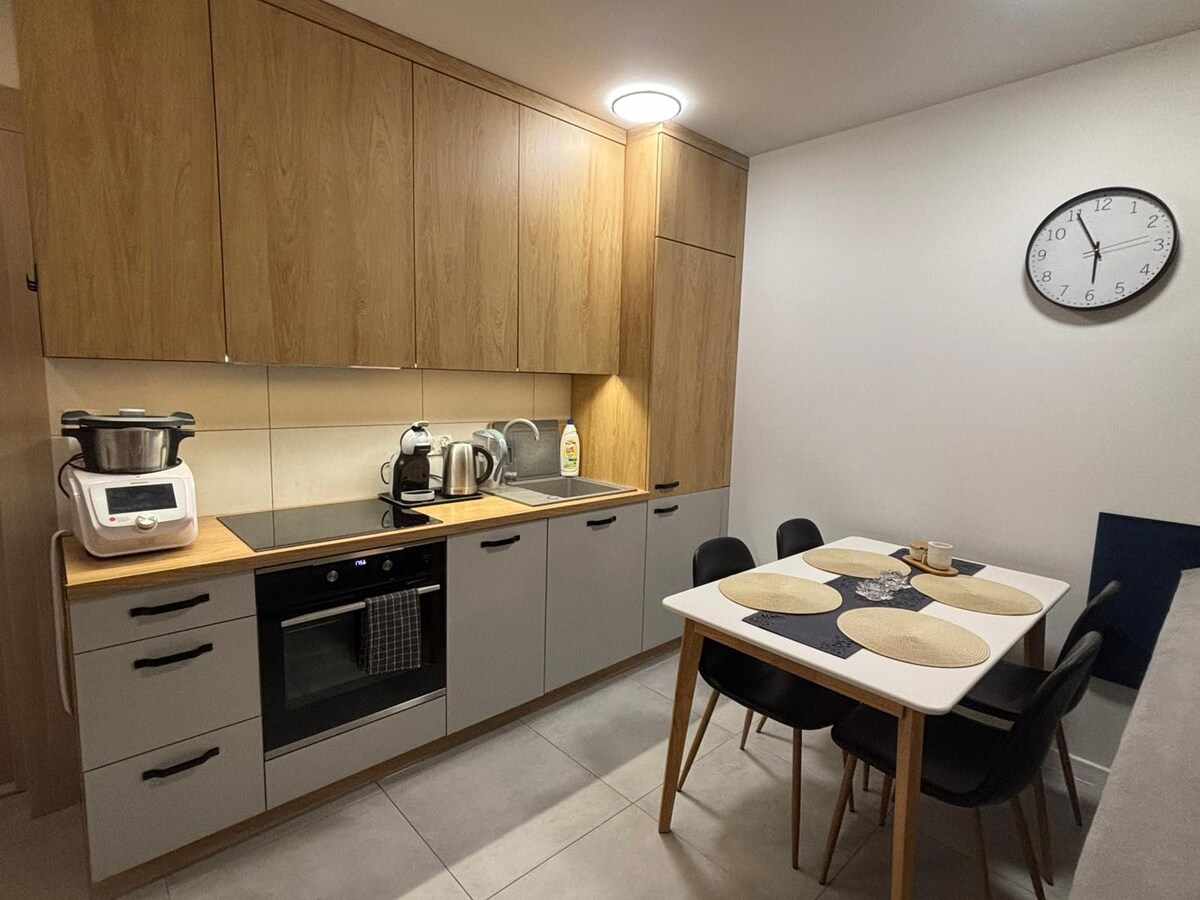 A modern, bright 57 m² apartment with a view of the marina is the perfect place to relax in comfortable surroundings. The interior has been designed with attention to every detail — the combination of natural materials, pastel colors, and functional solutions creates a unique, cozy atmosphere for up to 4 adults.
