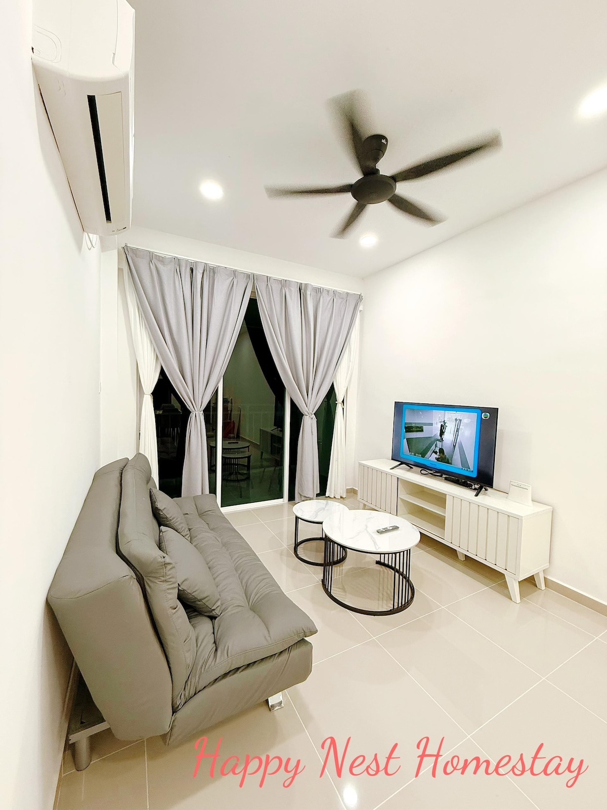 A contemporary apartment bathed in calming neutral colours provides you the relaxing ambience that you seek for during a getaway. Amidst the light and earthy colours, a mural depicting the Malaysia’s hornbill with a light turquoise background is the main accent of the living area. This spacious homestay is fully furnished with unlimited wifi provided.