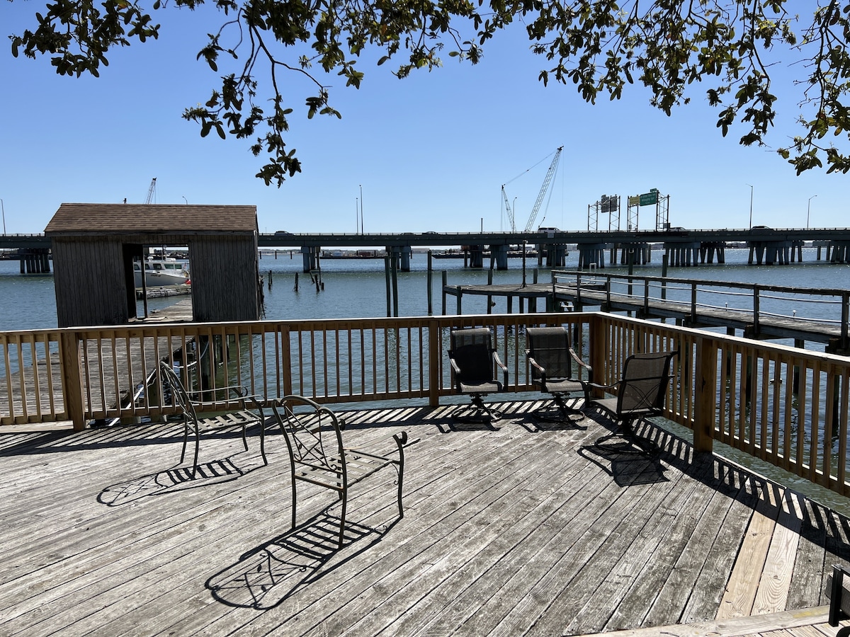 LESS THAN 1 MIN WALK TO WATERS EDGE. Fantastic beach home with 3 bdrms, 3 baths, Living room-dining rm combo with vaulted ceilings, kitchen, TV in 4 rooms, Wi-Fi, large deck with natural gas Weber grill, Washer-dryer. Great water views while you are relaxing on the deck. Many amenities! Just bring your bathing suit. Our guests have all said they love this place! Very close to many wedding venues, restaurants, state park, oceanfront boardwalk is closeby, military bases, etc.