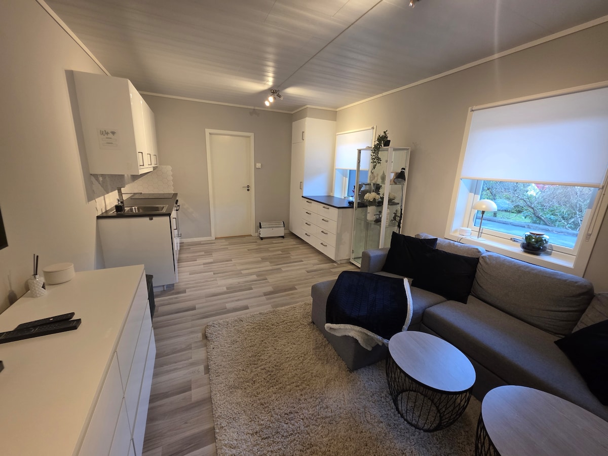 Great and modern apartment perfectly located in the heart of Goksøyr with a private shortcut up to the mountain and the puffins. You can't live any closer to the birds. The apartment is sparkling clean. New kitchen, fully equipped including induction cooktop, fridge+freezer, and dishwasher. Nice living room with TV and fast wifi. Fresh bathroom. Large laundry room available on request. Very quiet and peaceful place with a fabulous view of the mountain, waterfall, and the North Sea.