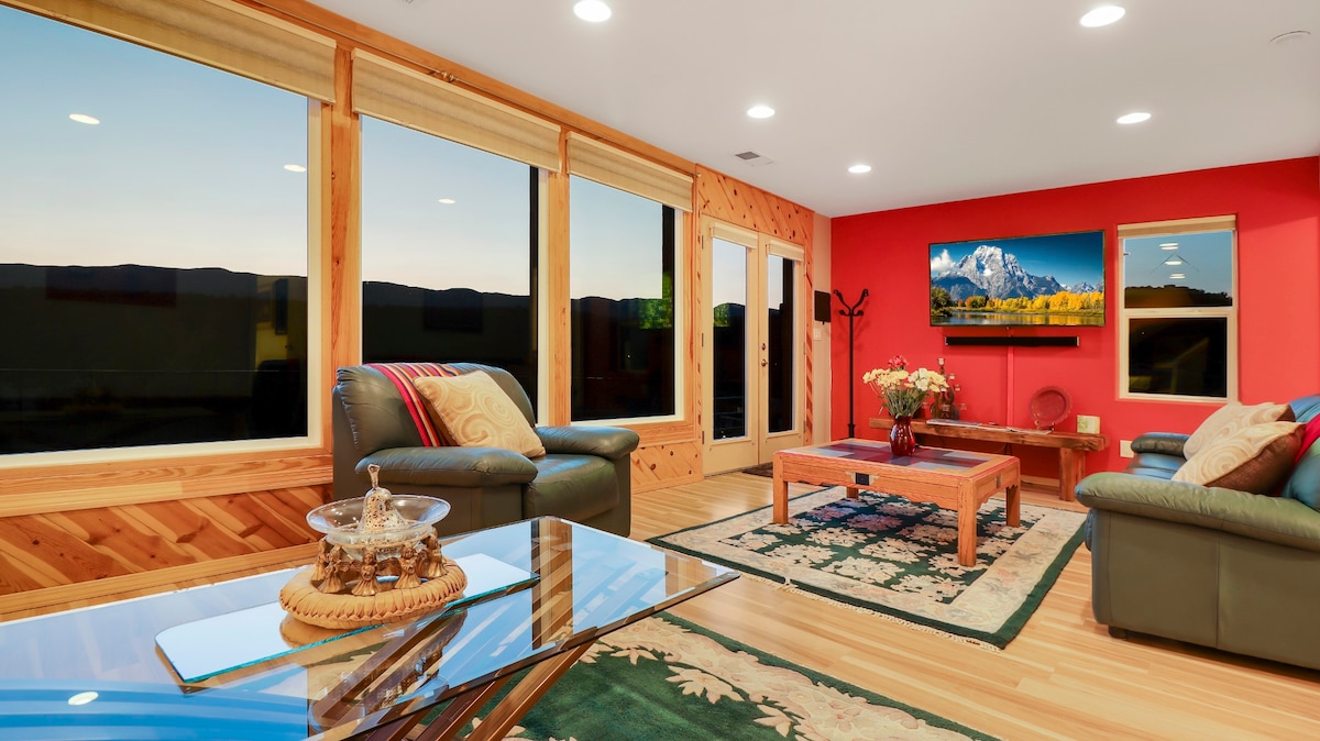 Located amid the trees in Sandia Park. The refreshingly open layout and floor to ceiling windows offers a serene relationship with the outdoors. The living room houses an array of contemporary furniture around a pellet stove. The kitchen is fully illuminated during the day by the wraparound windows. The contemporary home created offers impressive views of the nearby mountain range. Only 35 minutes to balloon fiesta. Visit Balloon fiesta during day and enjoy Skyline Glass House at night.