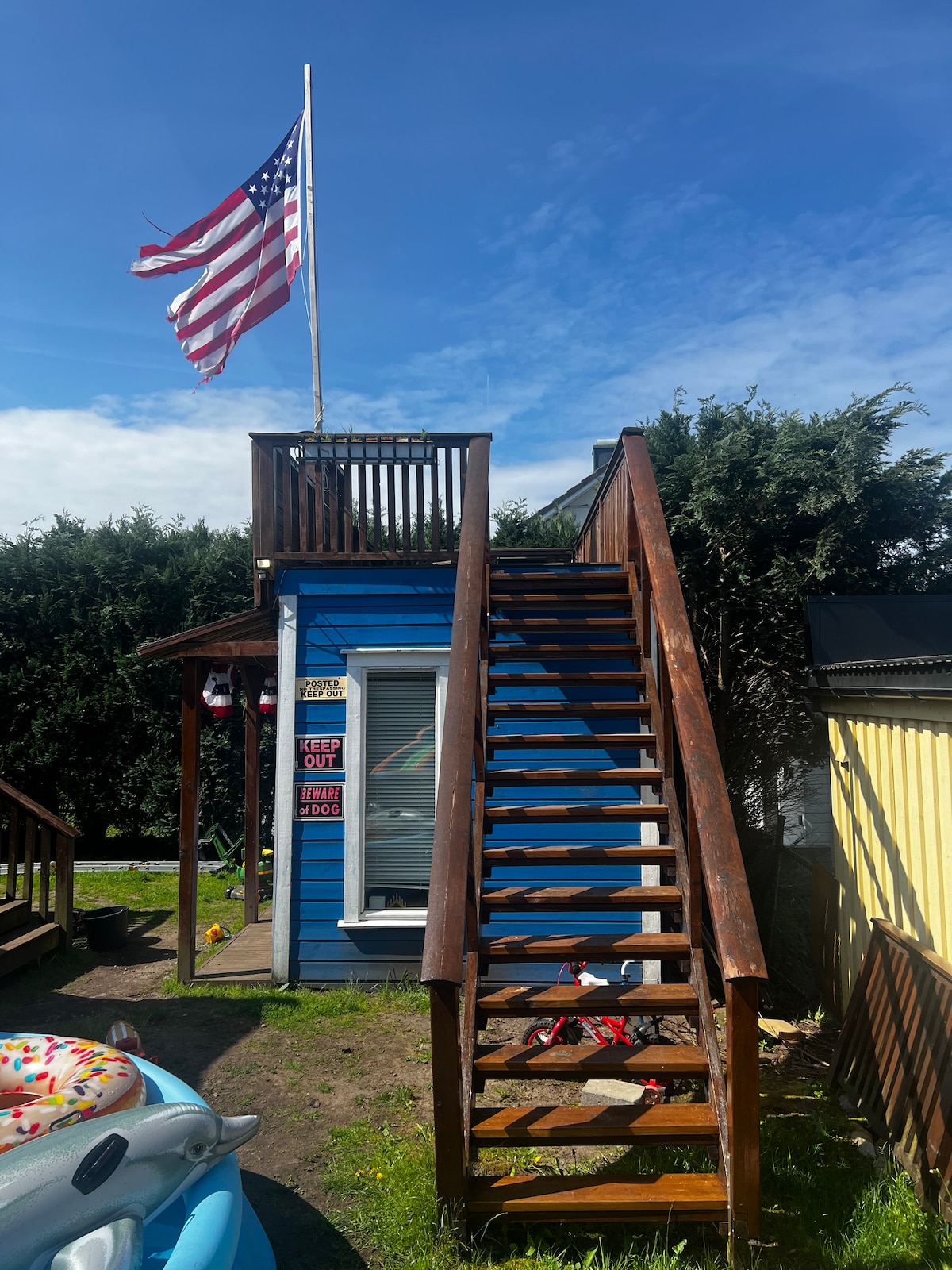 Our very tiny Cowboy Cabin was built after repeated visits to the motel The Old West Inn, in Willits, CA (USA). The house was first planned as a playhouse, then it became more advanced and has served as a playhouse and guest house. Electricity and wifi are installed, cabin toilet and cabin sink (there is no shower). There is a fire pit, sundeck on the roof with sun from morning to evening, if the sun is shining. The cabin is tiny, but has many smart solutions for good well-being and coziness.