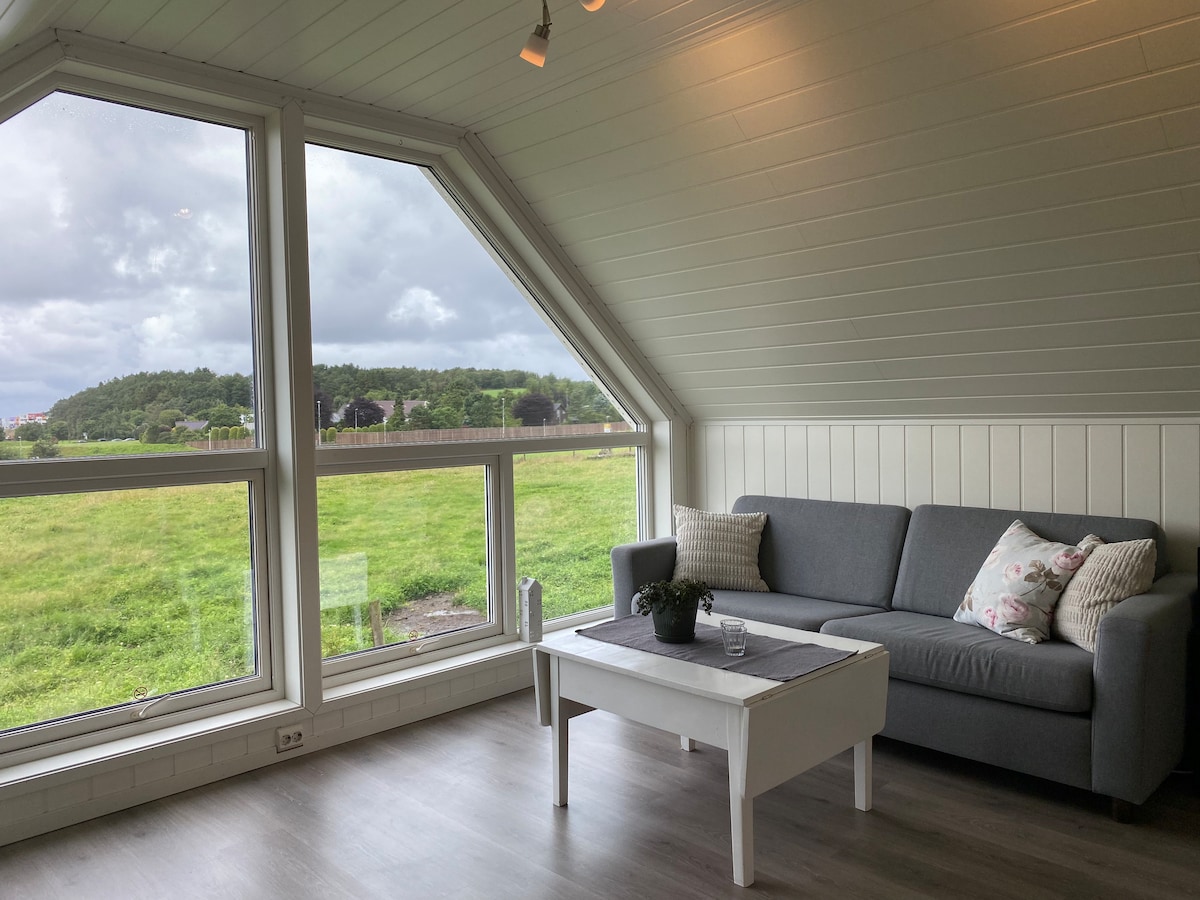 Landlig beliggende loftstue med egen inngang via utvendig spiraltrapp og balkong. Bad med dusj og toalett. Lys og luftig stue med store panoramavinduer hvor du fra sofaen kan nyte utsikt mot flott natur og sauer som beiter like utenfor. Ikke kjøkken, men vannkoker, minikjøleskap, mikrobølgeovn og kopper til disposisjon. Rolig område midt mellom Forus, Sola og Sandnes. 5,4km til Stavanger Lufthavn Sola. Nærmeste busstopp er 1,3km/ 15 min gange unna. Egen bil anbefales.