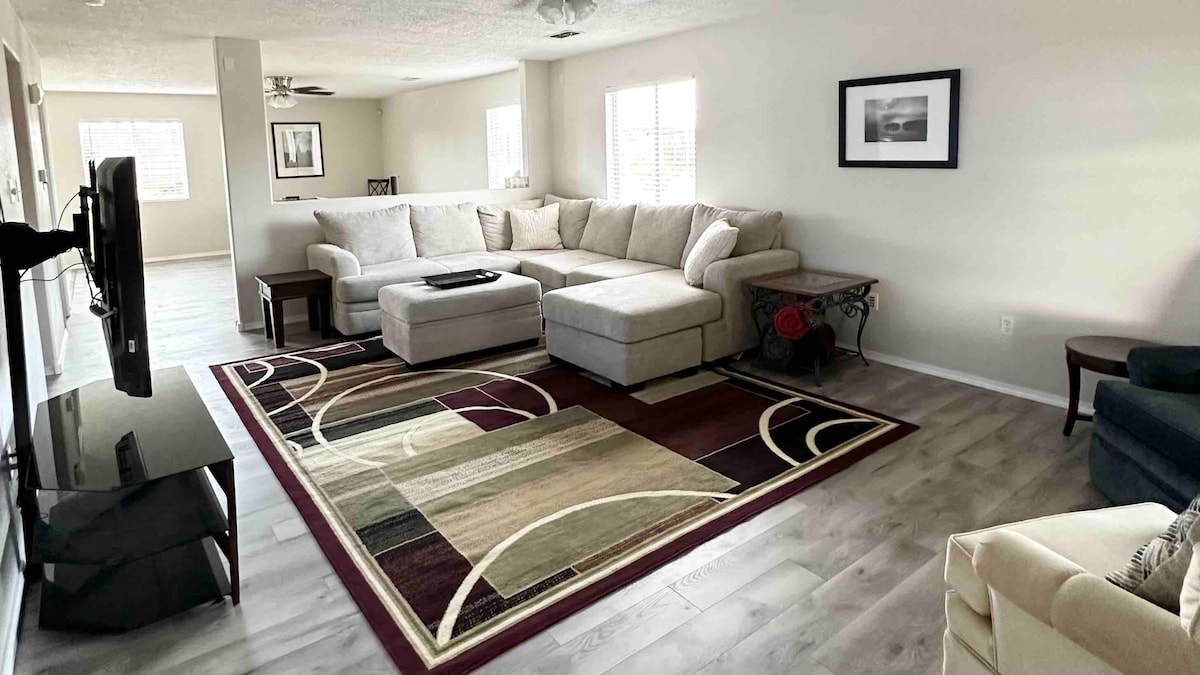 Modern 2-bedroom home in Rio Rancho. Everything was remodeled. 2 bedrooms with queen beds, and a fully non-smoking space. A small third bedroom I keep private as an owner's closet. Adjacent to Albuquerque, near Petroglyphs, Sandia Mountain Tramway, and about an hour+ to Santa Fe. Even though the entire home is "one level," there are two steps to a sunken living room. Free 50-amp EV charging outlet L2 (NEMA 14-50) so bring your own charging cable/adapter. (If you forget it, let me know.)