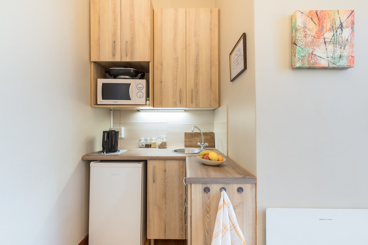 This is a small quaint cottage with private entrance opening onto a patio with bistro table. This nearly 100 year old cottage, has been restored by an architect and modernised, but retains it's old world charm. Exposed beams, a cement floor, and other original fittings . There is a compact kitchenette with basic cooking items. A double bed , free wi-fi , Tv with hotel bouquet. Decorated in white. Private en-suite bathroom with shower. There is alternate power during load shedding.